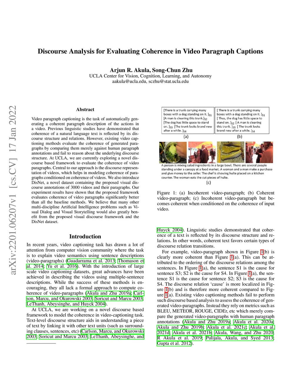 Video paragraph captioning is the task of automatically generating a coherent paragraph description of the actions in a video. Previous linguistic studies have demonstrated that coherence of a natural language text is reflected by its discourse structure and relations. However, existing video captioning methods evaluate the coherence of generated paragraphs by comparing them merely against human paragraph annotations and fail to reason about the underlying discourse structure. At UCLA, we are currently exploring a novel discourse based framework to evaluate the coherence of video paragraphs. Central to our approach is the discourse representation of videos, which helps in modeling coherence of paragraphs conditioned on coherence of videos. We also introduce DisNet, a novel dataset containing the proposed visual discourse annotations of 3000 videos and their paragraphs. Our experiment results have shown that the proposed framework evaluates coherence of video paragraphs significantly better than all the baseline methods. We believe that many other multi-discipline Artificial Intelligence problems such as Visual Dialog and Visual Storytelling would also greatly benefit from the proposed visual discourse framework and the DisNet dataset.