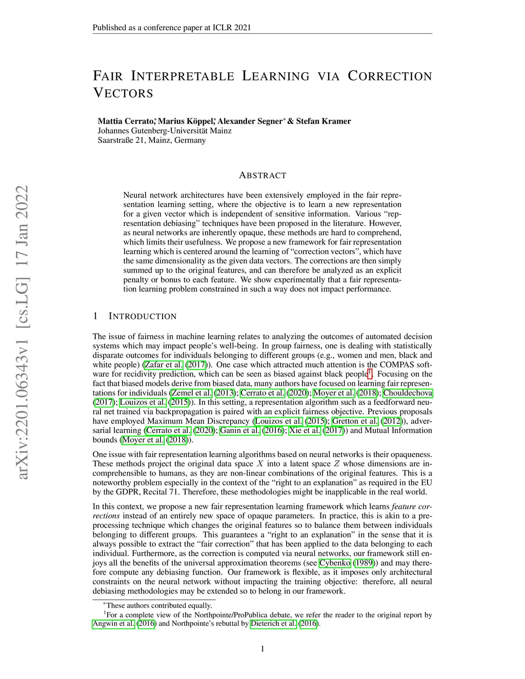 Neural network architectures have been extensively employed in the fair representation learning setting, where the objective is to learn a new representation for a given vector which is independent of sensitive information. Various "representation debiasing" techniques have been proposed in the literature. However, as neural networks are inherently opaque, these methods are hard to comprehend, which limits their usefulness. We propose a new framework for fair representation learning which is centered around the learning of "correction vectors", which have the same dimensionality as the given data vectors. The corrections are then simply summed up to the original features, and can therefore be analyzed as an explicit penalty or bonus to each feature. We show experimentally that a fair representation learning problem constrained in such a way does not impact performance.