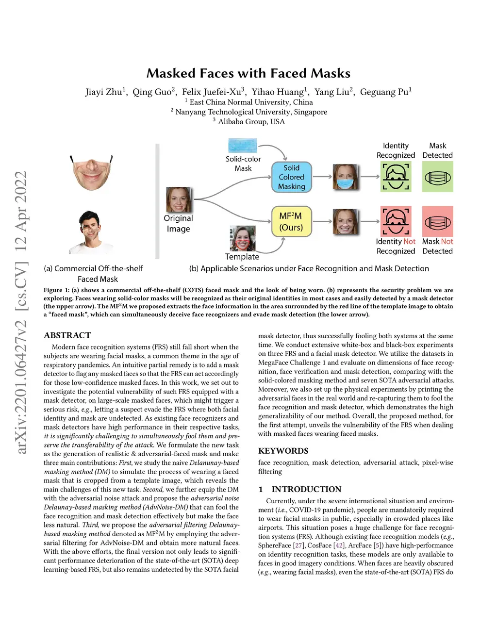 Modern face recognition systems (FRS) still fall short when the subjects are wearing facial masks, a common theme in the age of respiratory pandemics. An intuitive partial remedy is to add a mask detector to flag any masked faces so that the FRS can act accordingly for those low-confidence masked faces. In this work, we set out to investigate the potential vulnerability of such FRS equipped with a mask detector, on large-scale masked faces, which might trigger a serious risk, e.g., letting a suspect evade the FRS where both facial identity and mask are undetected. As existing face recognizers and mask detectors have high performance in their respective tasks, it is significantly challenging to simultaneously fool them and preserve the transferability of the attack. We formulate the new task as the generation of realistic & adversarial-faced mask and make three main contributions: First, we study the naive Delanunay-based masking method (DM) to simulate the process of wearing a faced mask that is cropped from a template image, which reveals the main challenges of this new task. Second, we further equip the DM with the adversarial noise attack and propose the adversarial noise Delaunay-based masking method (AdvNoise-DM) that can fool the face recognition and mask detection effectively but make the face less natural. Third, we propose the adversarial filtering Delaunay-based masking method denoted as MF2M by employing the adversarial filtering for AdvNoise-DM and obtain more natural faces. With the above efforts, the final version not only leads to significant performance deterioration of the state-of-the-art (SOTA) deep learning-based FRS, but also remains undetected by the SOTA facial mask detector, thus successfully fooling both systems at the same time.