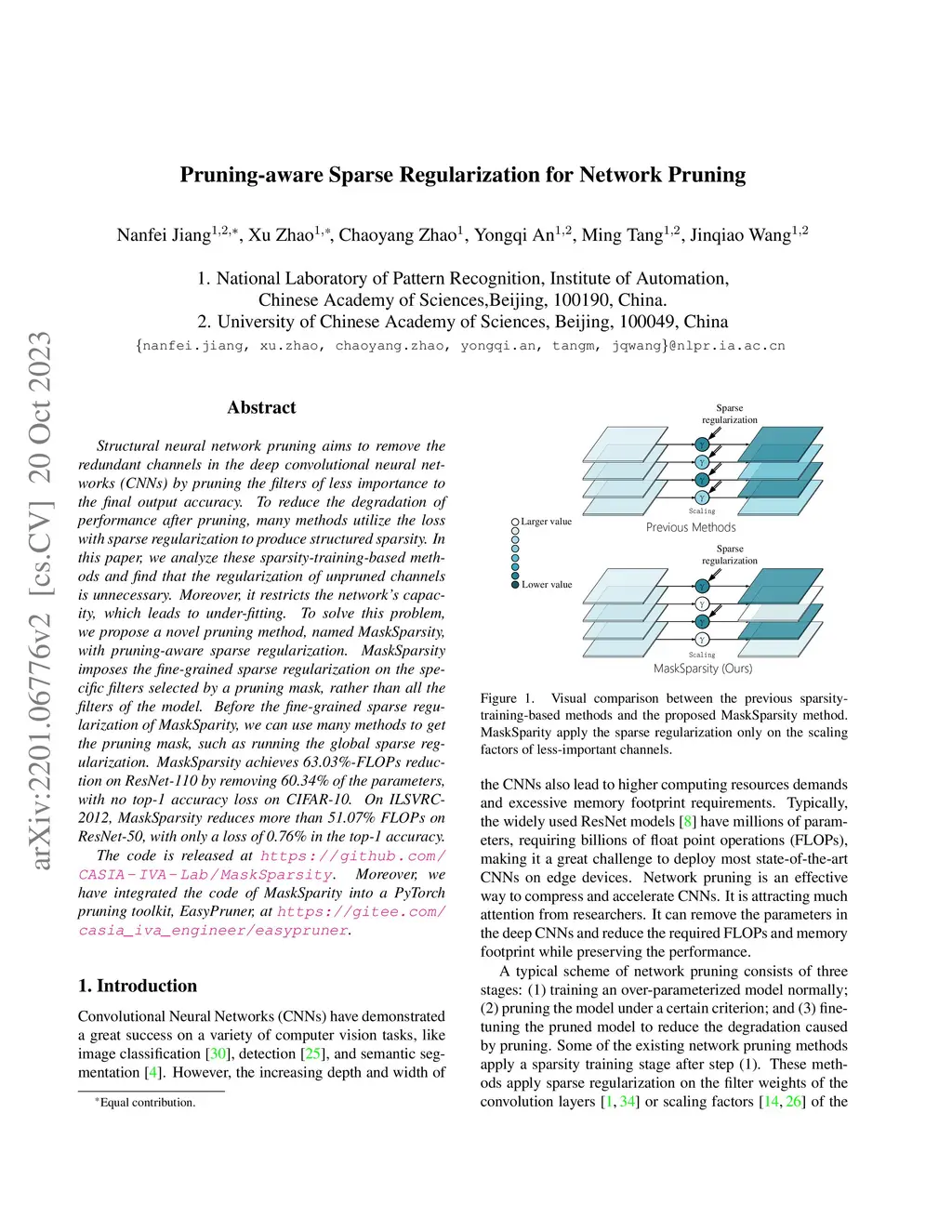 Structural neural network pruning aims to remove the redundant channels in the deep convolutional neural networks (CNNs) by pruning the filters of less importance to the final output accuracy. To reduce the degradation of performance after pruning, many methods utilize the loss with sparse regularization to produce structured sparsity. In this paper, we analyze these sparsity-training-based methods and find that the regularization of unpruned channels is unnecessary. Moreover, it restricts the network's capacity, which leads to under-fitting. To solve this problem, we propose a novel pruning method, named MaskSparsity, with pruning-aware sparse regularization. MaskSparsity imposes the fine-grained sparse regularization on the specific filters selected by a pruning mask, rather than all the filters of the model. Before the fine-grained sparse regularization of MaskSparity, we can use many methods to get the pruning mask, such as running the global sparse regularization. MaskSparsity achieves 63.03%-FLOPs reduction on ResNet-110 by removing 60.34% of the parameters, with no top-1 accuracy loss on CIFAR-10. On ILSVRC-2012, MaskSparsity reduces more than 51.07% FLOPs on ResNet-50, with only a loss of 0.76% in the top-1 accuracy. The code is released at https://github.com/CASIA-IVA-Lab/MaskSparsity. Moreover, we have integrated the code of MaskSparity into a PyTorch pruning toolkit, EasyPruner, at https://gitee.com/casia_iva_engineer/easypruner.