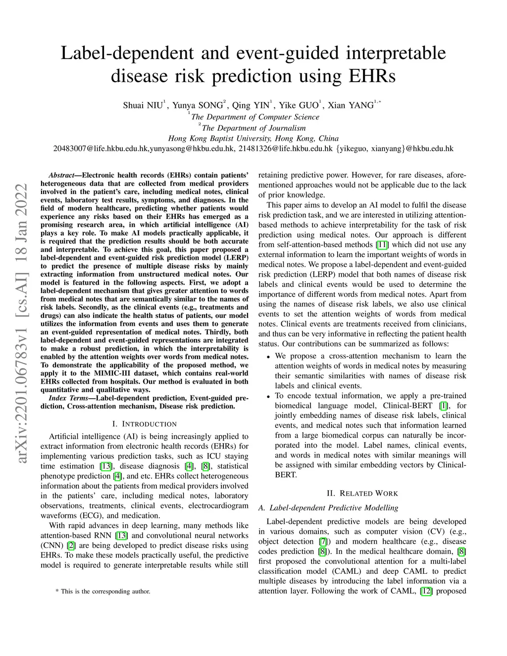Electronic health records (EHRs) contain patients' heterogeneous data that are collected from medical providers involved in the patient's care, including medical notes, clinical events, laboratory test results, symptoms, and diagnoses. In the field of modern healthcare, predicting whether patients would experience any risks based on their EHRs has emerged as a promising research area, in which artificial intelligence (AI) plays a key role. To make AI models practically applicable, it is required that the prediction results should be both accurate and interpretable. To achieve this goal, this paper proposed a label-dependent and event-guided risk prediction model (LERP) to predict the presence of multiple disease risks by mainly extracting information from unstructured medical notes. Our model is featured in the following aspects. First, we adopt a label-dependent mechanism that gives greater attention to words from medical notes that are semantically similar to the names of risk labels. Secondly, as the clinical events (e.g., treatments and drugs) can also indicate the health status of patients, our model utilizes the information from events and uses them to generate an event-guided representation of medical notes. Thirdly, both label-dependent and event-guided representations are integrated to make a robust prediction, in which the interpretability is enabled by the attention weights over words from medical notes. To demonstrate the applicability of the proposed method, we apply it to the MIMIC-III dataset, which contains real-world EHRs collected from hospitals. Our method is evaluated in both quantitative and qualitative ways.