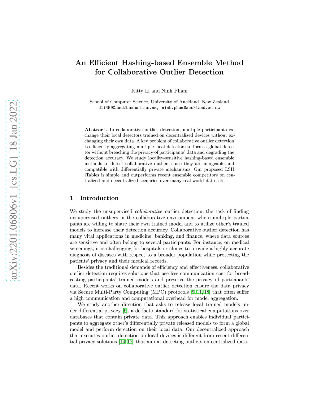 In collaborative outlier detection, multiple participants exchange their local detectors trained on decentralized devices without exchanging their own data. A key problem of collaborative outlier detection is efficiently aggregating multiple local detectors to form a global detector without breaching the privacy of participants' data and degrading the detection accuracy. We study locality-sensitive hashing-based ensemble methods to detect collaborative outliers since they are mergeable and compatible with differentially private mechanisms. Our proposed LSH iTables is simple and outperforms recent ensemble competitors on centralized and decentralized scenarios over many real-world data sets.