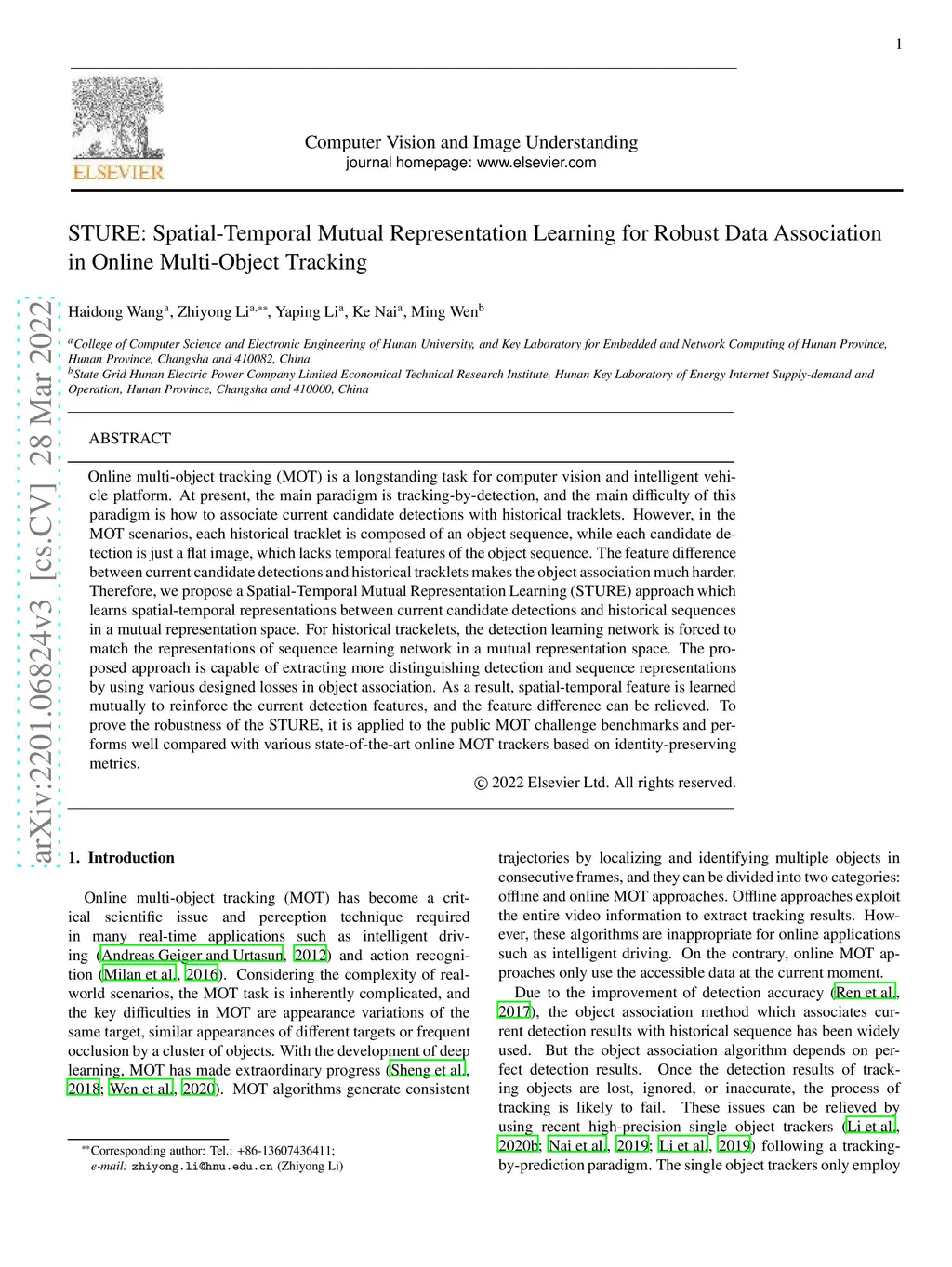 Online multi-object tracking (MOT) is a longstanding task for computer vision and intelligent vehicle platform. At present, the main paradigm is tracking-by-detection, and the main difficulty of this paradigm is how to associate current candidate detections with historical tracklets. However, in the MOT scenarios, each historical tracklet is composed of an object sequence, while each candidate detection is just a flat image, which lacks temporal features of the object sequence. The feature difference between current candidate detections and historical tracklets makes the object association much harder. Therefore, we propose a Spatial-Temporal Mutual Representation Learning (STURE) approach which learns spatial-temporal representations between current candidate detections and historical sequences in a mutual representation space. For historical trackelets, the detection learning network is forced to match the representations of sequence learning network in a mutual representation space. The proposed approach is capable of extracting more distinguishing detection and sequence representations by using various designed losses in object association. As a result, spatial-temporal feature is learned mutually to reinforce the current detection features, and the feature difference can be relieved. To prove the robustness of the STURE, it is applied to the public MOT challenge benchmarks and performs well compared with various state-of-the-art online MOT trackers based on identity-preserving metrics.