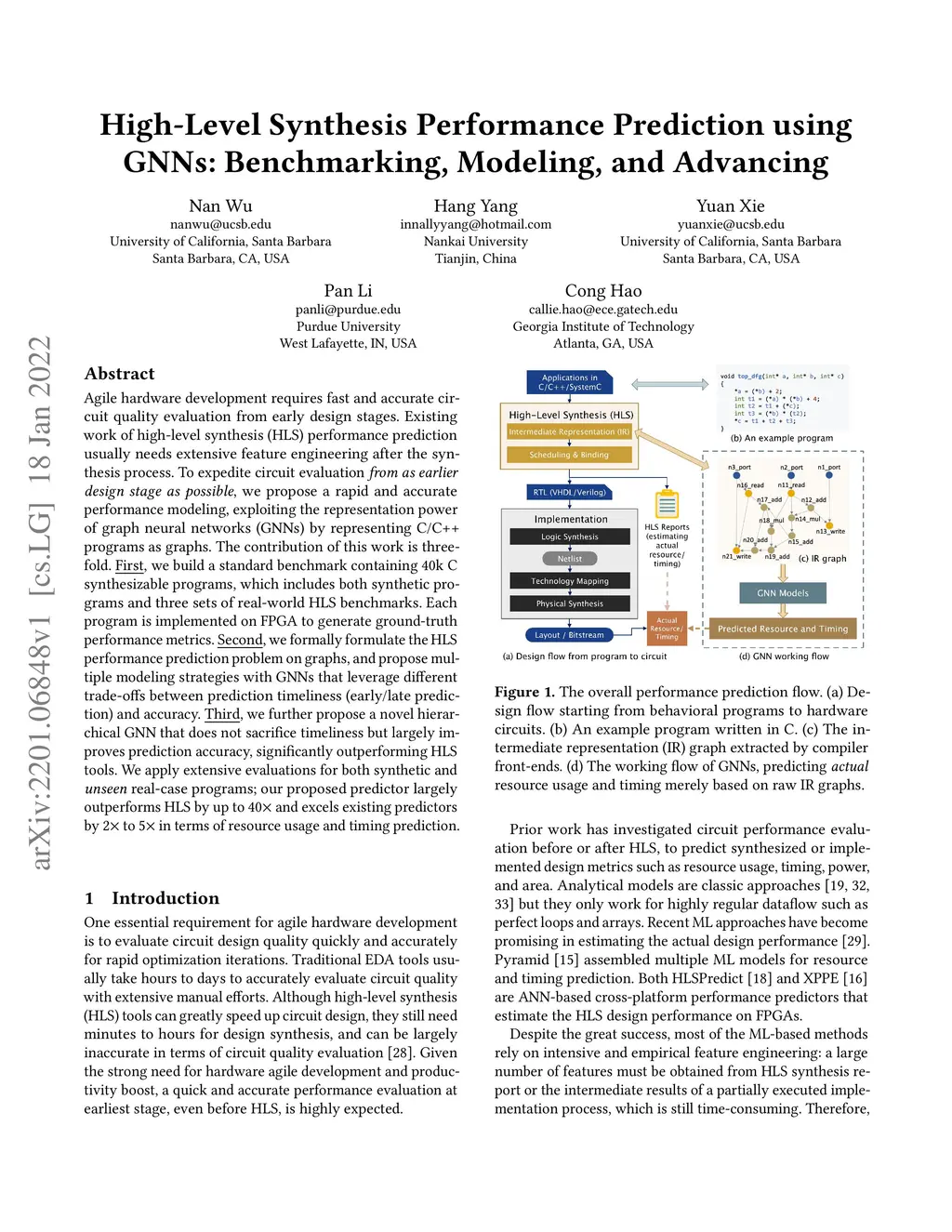 Agile hardware development requires fast and accurate circuit quality evaluation from early design stages. Existing work of high-level synthesis (HLS) performance prediction usually needs extensive feature engineering after the synthesis process. To expedite circuit evaluation from as earlier design stage as possible, we propose a rapid and accurate performance modeling, exploiting the representation power of graph neural networks (GNNs) by representing C/C++ programs as graphs. The contribution of this work is three-fold. First, we build a standard benchmark containing 40k C synthesizable programs, which includes both synthetic programs and three sets of real-world HLS benchmarks. Each program is implemented on FPGA to generate ground-truth performance metrics. Second, we formally formulate the HLS performance prediction problem on graphs, and propose multiple modeling strategies with GNNs that leverage different trade-offs between prediction timeliness (early/late prediction) and accuracy. Third, we further propose a novel hierarchical GNN that does not sacrifice timeliness but largely improves prediction accuracy, significantly outperforming HLS tools. We apply extensive evaluations for both synthetic and unseen real-case programs; our proposed predictor largely outperforms HLS by up to 40X and excels existing predictors by 2X to 5X in terms of resource usage and timing prediction.