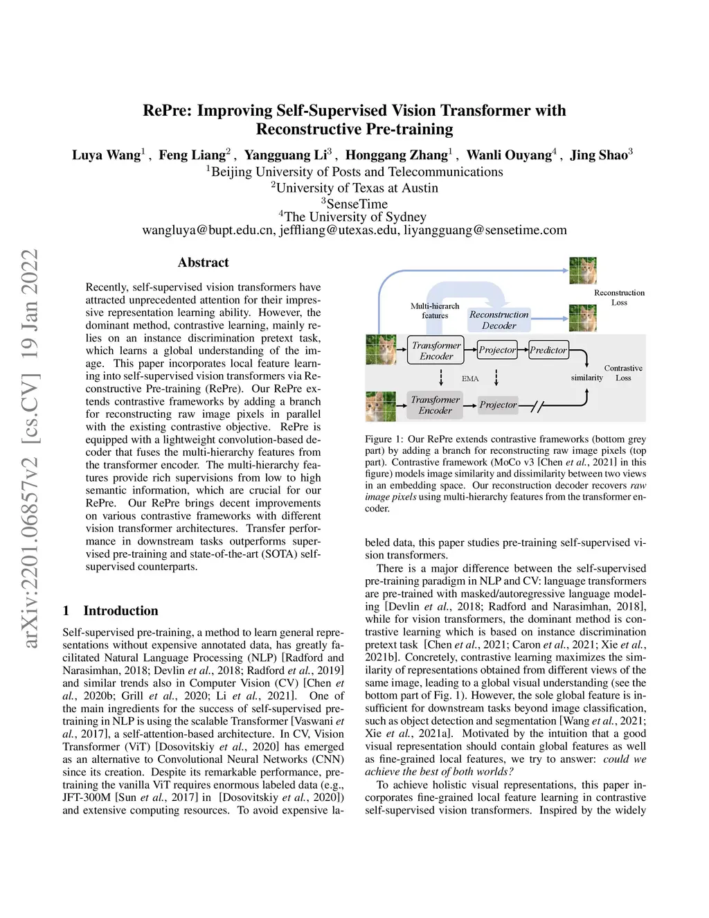 Recently, self-supervised vision transformers have attracted unprecedented attention for their impressive representation learning ability. However, the dominant method, contrastive learning, mainly relies on an instance discrimination pretext task, which learns a global understanding of the image. This paper incorporates local feature learning into self-supervised vision transformers via Reconstructive Pre-training (RePre). Our RePre extends contrastive frameworks by adding a branch for reconstructing raw image pixels in parallel with the existing contrastive objective. RePre is equipped with a lightweight convolution-based decoder that fuses the multi-hierarchy features from the transformer encoder. The multi-hierarchy features provide rich supervisions from low to high semantic information, which are crucial for our RePre. Our RePre brings decent improvements on various contrastive frameworks with different vision transformer architectures. Transfer performance in downstream tasks outperforms supervised pre-training and state-of-the-art (SOTA) self-supervised counterparts.