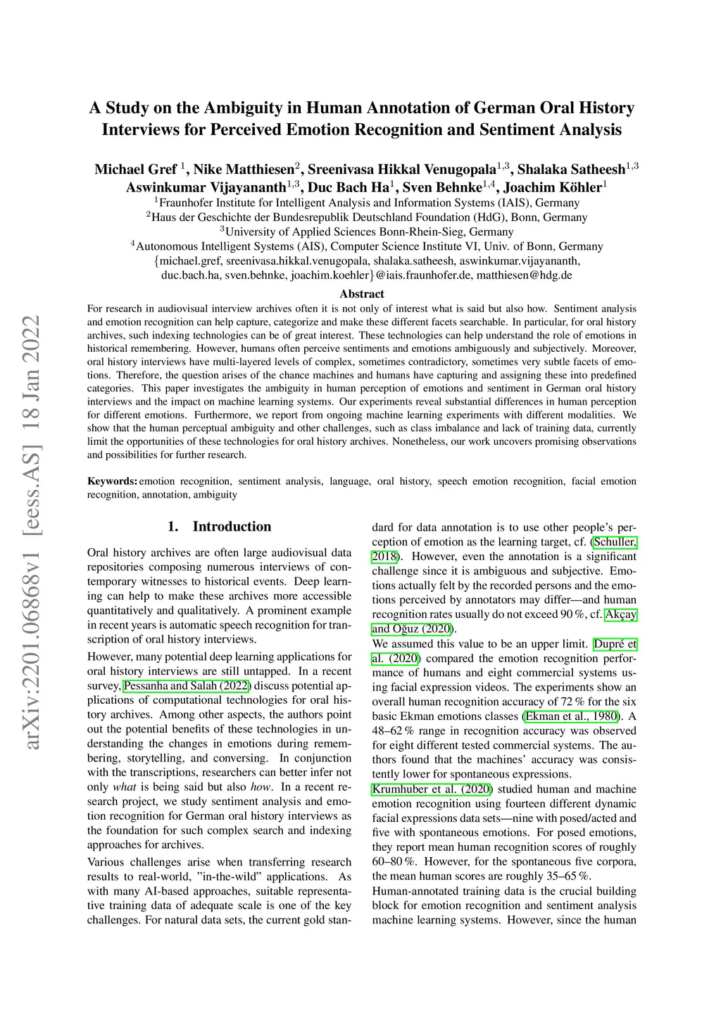 For research in audiovisual interview archives often it is not only of interest what is said but also how. Sentiment analysis and emotion recognition can help capture, categorize and make these different facets searchable. In particular, for oral history archives, such indexing technologies can be of great interest. These technologies can help understand the role of emotions in historical remembering. However, humans often perceive sentiments and emotions ambiguously and subjectively. Moreover, oral history interviews have multi-layered levels of complex, sometimes contradictory, sometimes very subtle facets of emotions. Therefore, the question arises of the chance machines and humans have capturing and assigning these into predefined categories. This paper investigates the ambiguity in human perception of emotions and sentiment in German oral history interviews and the impact on machine learning systems. Our experiments reveal substantial differences in human perception for different emotions. Furthermore, we report from ongoing machine learning experiments with different modalities. We show that the human perceptual ambiguity and other challenges, such as class imbalance and lack of training data, currently limit the opportunities of these technologies for oral history archives. Nonetheless, our work uncovers promising observations and possibilities for further research.