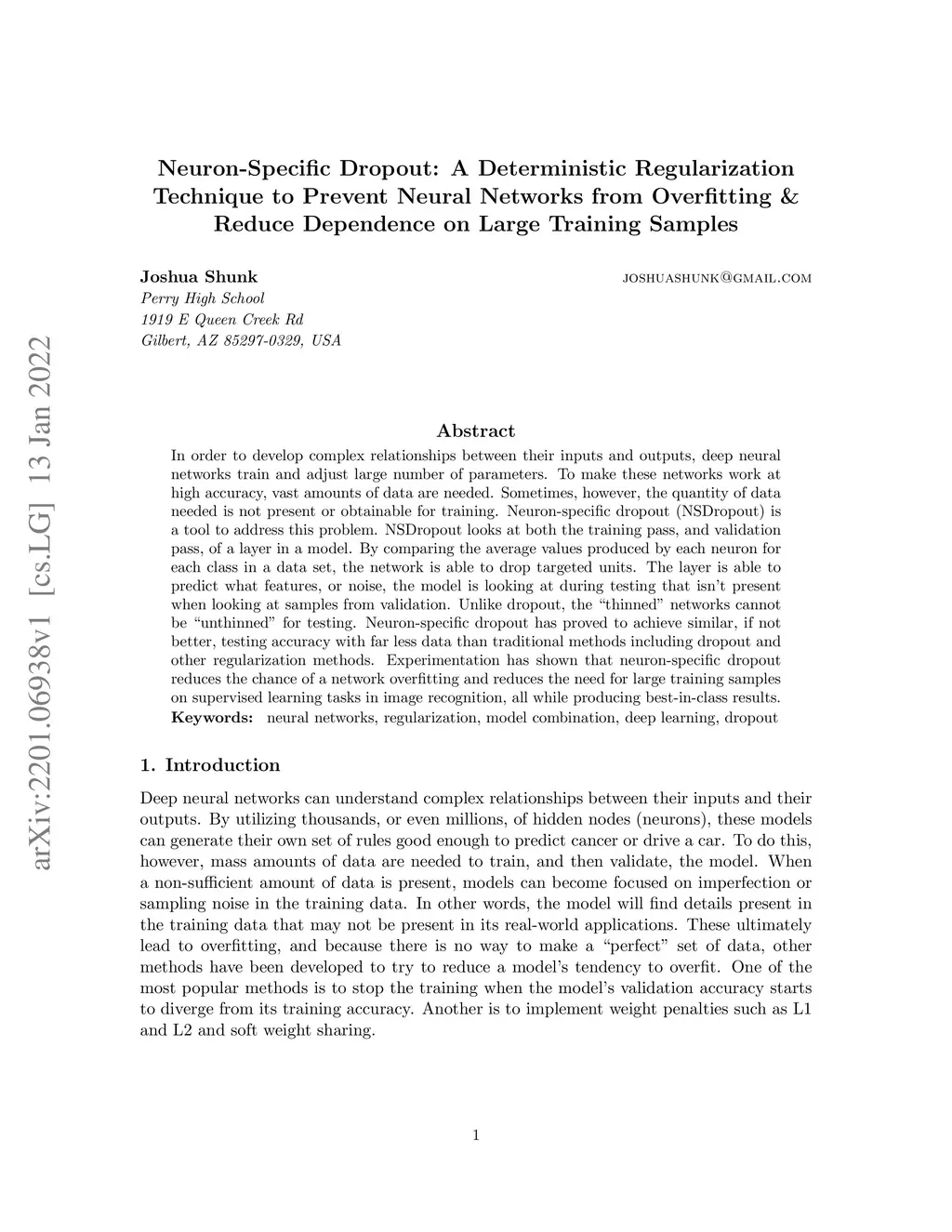 In order to develop complex relationships between their inputs and outputs, deep neural networks train and adjust large number of parameters. To make these networks work at high accuracy, vast amounts of data are needed. Sometimes, however, the quantity of data needed is not present or obtainable for training. Neuron-specific dropout (NSDropout) is a tool to address this problem. NSDropout looks at both the training pass, and validation pass, of a layer in a model. By comparing the average values produced by each neuron for each class in a data set, the network is able to drop targeted units. The layer is able to predict what features, or noise, the model is looking at during testing that isn't present when looking at samples from validation. Unlike dropout, the "thinned" networks cannot be "unthinned" for testing. Neuron-specific dropout has proved to achieve similar, if not better, testing accuracy with far less data than traditional methods including dropout and other regularization methods. Experimentation has shown that neuron-specific dropout reduces the chance of a network overfitting and reduces the need for large training samples on supervised learning tasks in image recognition, all while producing best-in-class results.