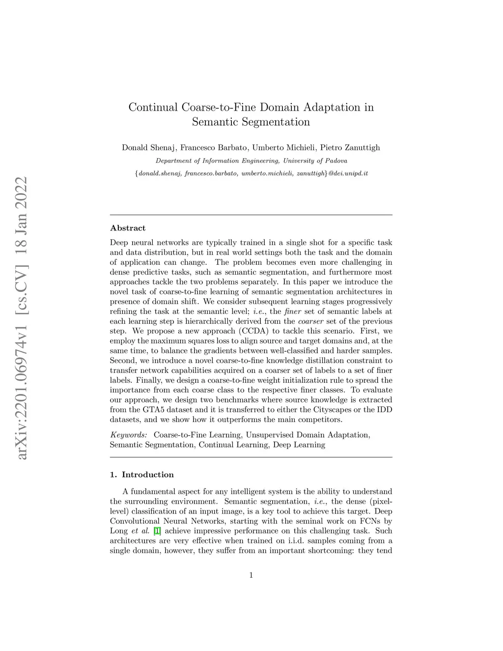Deep neural networks are typically trained in a single shot for a specific task and data distribution, but in real world settings both the task and the domain of application can change. The problem becomes even more challenging in dense predictive tasks, such as semantic segmentation, and furthermore most approaches tackle the two problems separately. In this paper we introduce the novel task of coarse-to-fine learning of semantic segmentation architectures in presence of domain shift. We consider subsequent learning stages progressively refining the task at the semantic level; i.e., the finer set of semantic labels at each learning step is hierarchically derived from the coarser set of the previous step. We propose a new approach (CCDA) to tackle this scenario. First, we employ the maximum squares loss to align source and target domains and, at the same time, to balance the gradients between well-classified and harder samples. Second, we introduce a novel coarse-to-fine knowledge distillation constraint to transfer network capabilities acquired on a coarser set of labels to a set of finer labels. Finally, we design a coarse-to-fine weight initialization rule to spread the importance from each coarse class to the respective finer classes. To evaluate our approach, we design two benchmarks where source knowledge is extracted from the GTA5 dataset and it is transferred to either the Cityscapes or the IDD datasets, and we show how it outperforms the main competitors.