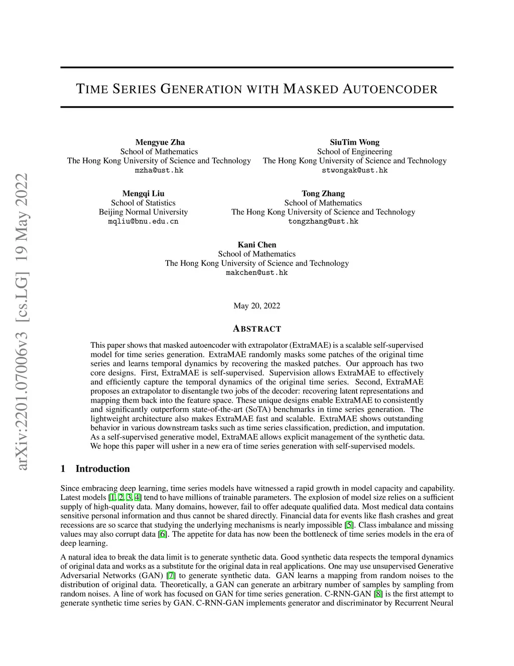 This paper shows that masked autoencoder with extrapolator (ExtraMAE) is a scalable self-supervised model for time series generation. ExtraMAE randomly masks some patches of the original time series and learns temporal dynamics by recovering the masked patches. Our approach has two core designs. First, ExtraMAE is self-supervised. Supervision allows ExtraMAE to effectively and efficiently capture the temporal dynamics of the original time series. Second, ExtraMAE proposes an extrapolator to disentangle two jobs of the decoder: recovering latent representations and mapping them back into the feature space. These unique designs enable ExtraMAE to consistently and significantly outperform state-of-the-art (SoTA) benchmarks in time series generation. The lightweight architecture also makes ExtraMAE fast and scalable. ExtraMAE shows outstanding behavior in various downstream tasks such as time series classification, prediction, and imputation. As a self-supervised generative model, ExtraMAE allows explicit management of the synthetic data. We hope this paper will usher in a new era of time series generation with self-supervised models.