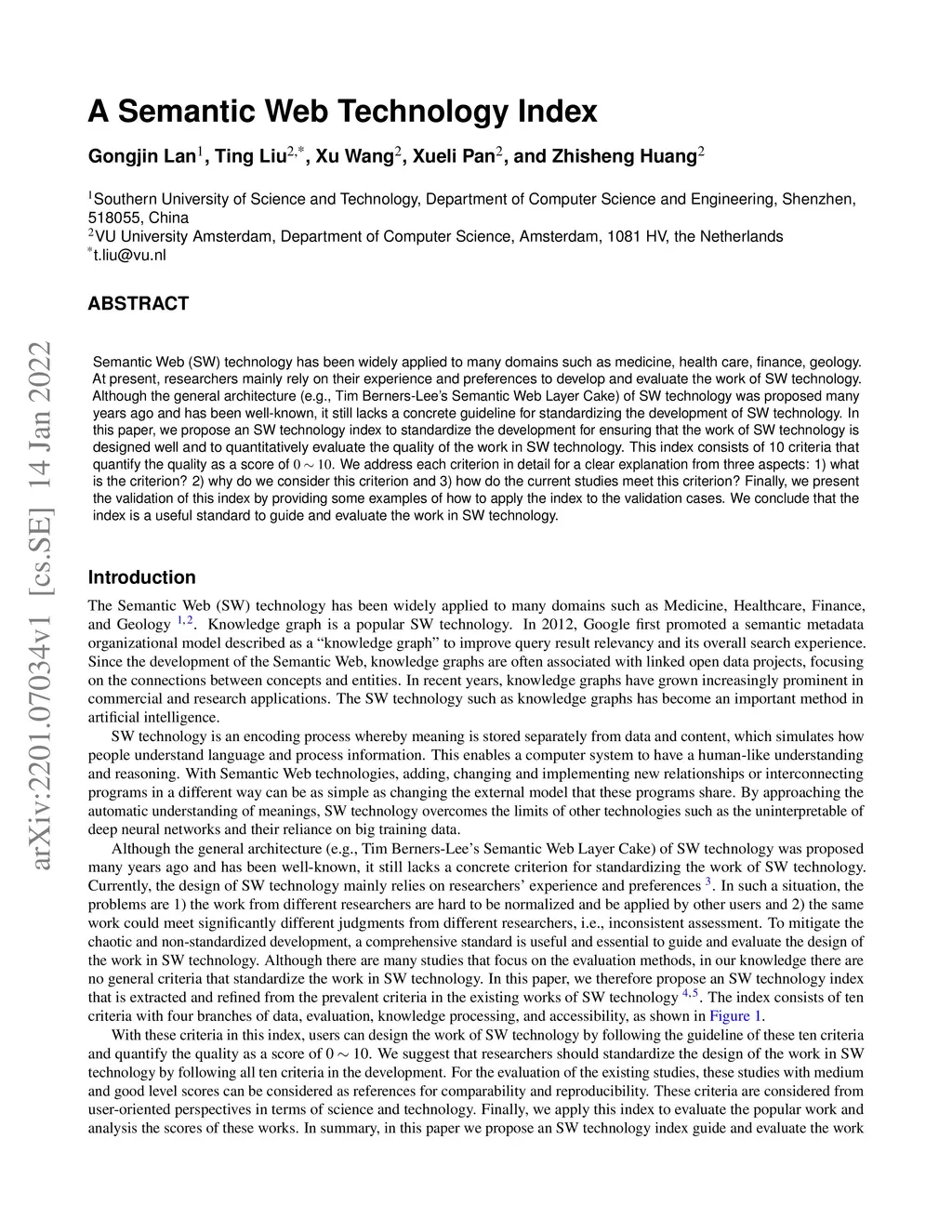 Semantic Web (SW) technology has been widely applied to many domains such as medicine, health care, finance, geology. At present, researchers mainly rely on their experience and preferences to develop and evaluate the work of SW technology. Although the general architecture (e.g., Tim Berners-Lee's Semantic Web Layer Cake) of SW technology was proposed many years ago and has been well-known, it still lacks a concrete guideline for standardizing the development of SW technology. In this paper, we propose an SW technology index to standardize the development for ensuring that the work of SW technology is designed well and to quantitatively evaluate the quality of the work in SW technology. This index consists of 10 criteria that quantify the quality as a score of 0 ~ 10. We address each criterion in detail for a clear explanation from three aspects: 1) what is the criterion? 2) why do we consider this criterion and 3) how do the current studies meet this criterion? Finally, we present the validation of this index by providing some examples of how to apply the index to the validation cases. We conclude that the index is a useful standard to guide and evaluate the work in SW technology.