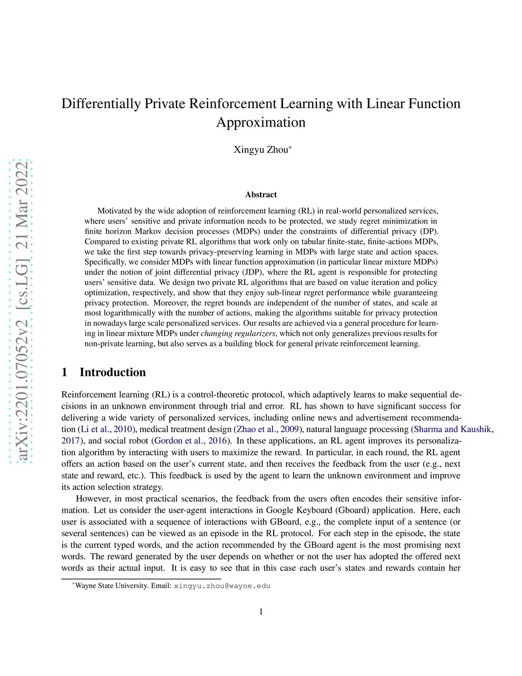 Motivated by the wide adoption of reinforcement learning (RL) in real-world personalized services, where users' sensitive and private information needs to be protected, we study regret minimization in finite-horizon Markov decision processes (MDPs) under the constraints of differential privacy (DP). Compared to existing private RL algorithms that work only on tabular finite-state, finite-actions MDPs, we take the first step towards privacy-preserving learning in MDPs with large state and action spaces. Specifically, we consider MDPs with linear function approximation (in particular linear mixture MDPs) under the notion of joint differential privacy (JDP), where the RL agent is responsible for protecting users' sensitive data. We design two private RL algorithms that are based on value iteration and policy optimization, respectively, and show that they enjoy sub-linear regret performance while guaranteeing privacy protection. Moreover, the regret bounds are independent of the number of states, and scale at most logarithmically with the number of actions, making the algorithms suitable for privacy protection in nowadays large-scale personalized services. Our results are achieved via a general procedure for learning in linear mixture MDPs under changing regularizers, which not only generalizes previous results for non-private learning, but also serves as a building block for general private reinforcement learning.