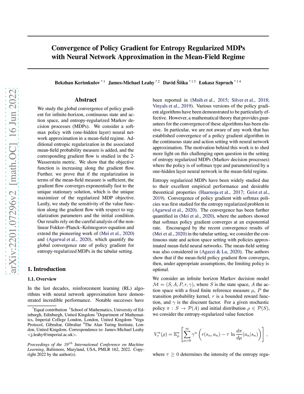 We study the global convergence of policy gradient for infinite-horizon, continuous state and action space, and entropy-regularized Markov decision processes (MDPs). We consider a softmax policy with (one-hidden layer) neural network approximation in a mean-field regime. Additional entropic regularization in the associated mean-field probability measure is added, and the corresponding gradient flow is studied in the 2-Wasserstein metric. We show that the objective function is increasing along the gradient flow. Further, we prove that if the regularization in terms of the mean-field measure is sufficient, the gradient flow converges exponentially fast to the unique stationary solution, which is the unique maximizer of the regularized MDP objective. Lastly, we study the sensitivity of the value function along the gradient flow with respect to regularization parameters and the initial condition. Our results rely on the careful analysis of the non-linear Fokker-Planck-Kolmogorov equation and extend the pioneering work of Mei et al. 2020 and Agarwal et al. 2020, which quantify the global convergence rate of policy gradient for entropy-regularized MDPs in the tabular setting.
