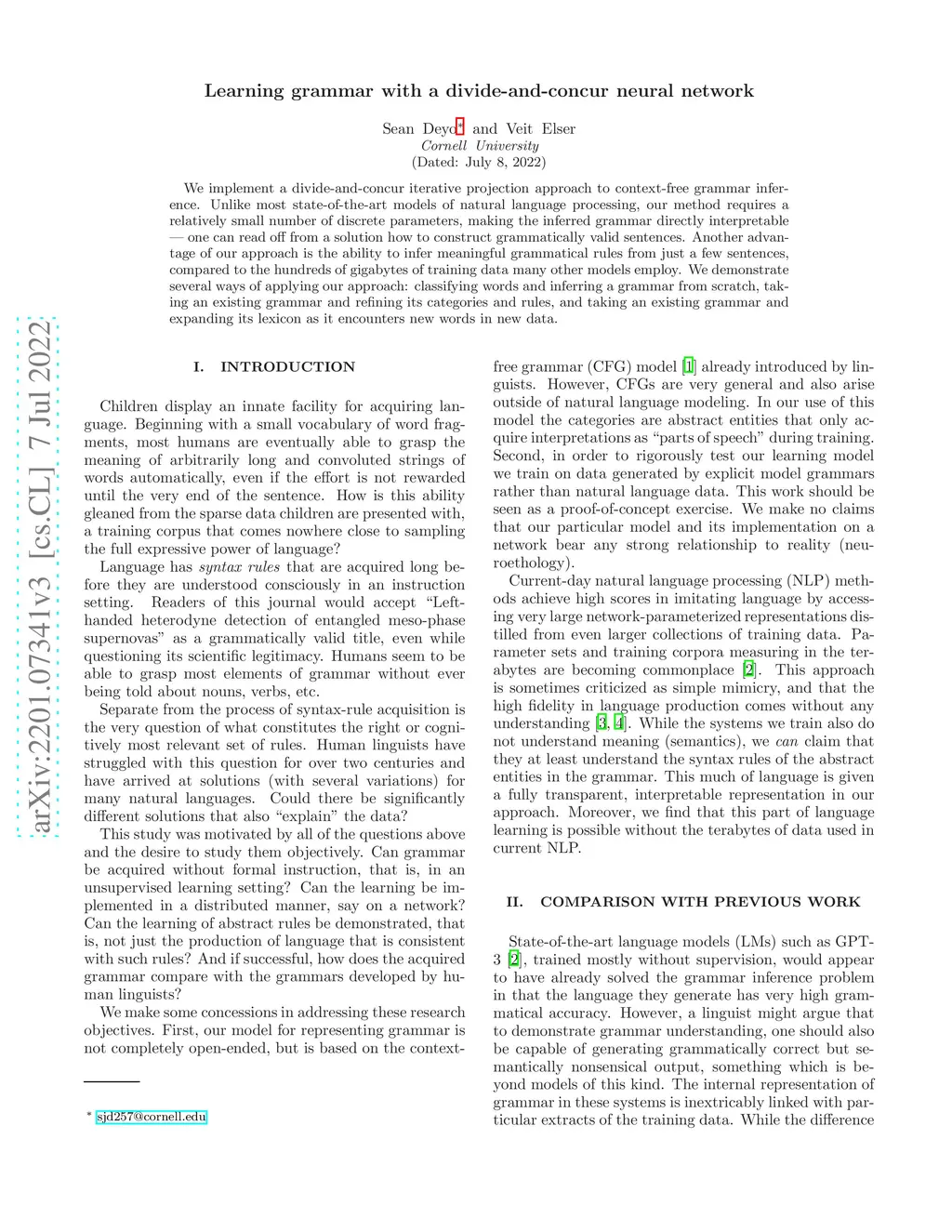 We implement a divide-and-concur iterative projection approach to context-free grammar inference. Unlike most state-of-the-art models of natural language processing, our method requires a relatively small number of discrete parameters, making the inferred grammar directly interpretable -- one can read off from a solution how to construct grammatically valid sentences. Another advantage of our approach is the ability to infer meaningful grammatical rules from just a few sentences, compared to the hundreds of gigabytes of training data many other models employ. We demonstrate several ways of applying our approach: classifying words and inferring a grammar from scratch, taking an existing grammar and refining its categories and rules, and taking an existing grammar and expanding its lexicon as it encounters new words in new data.