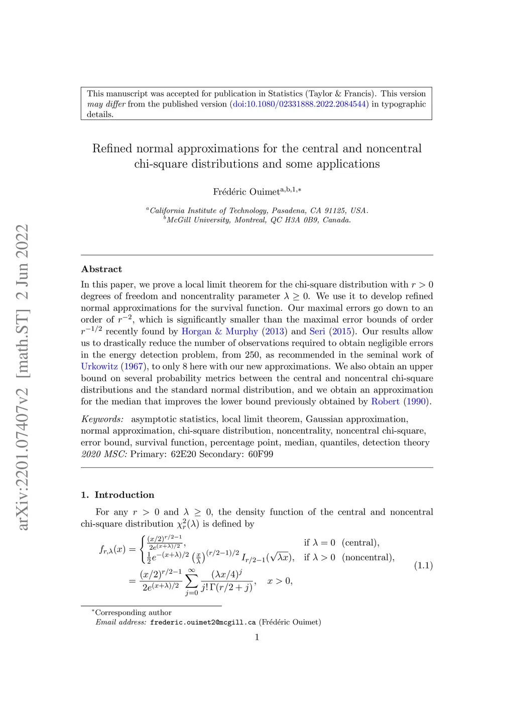 In this paper, we prove a local limit theorem for the chi-square distribution with degrees of freedom and noncentrality parameter . We use it to develop refined normal approximations for the survival function. Our maximal errors go down to an order of , which is significantly smaller than the maximal error bounds of order recently found by Horgan & Murphy (2013) and Seri (2015). Our results allow us to drastically reduce the number of observations required to obtain negligible errors in the energy detection problem, from , as recommended in the seminal work of Urkowitz (1967), to only here with our new approximations. We also obtain an upper bound on several probability metrics between the central and noncentral chi-square distributions and the standard normal distribution, and we obtain an approximation for the median that improves the lower bound previously obtained by Robert (1990).
