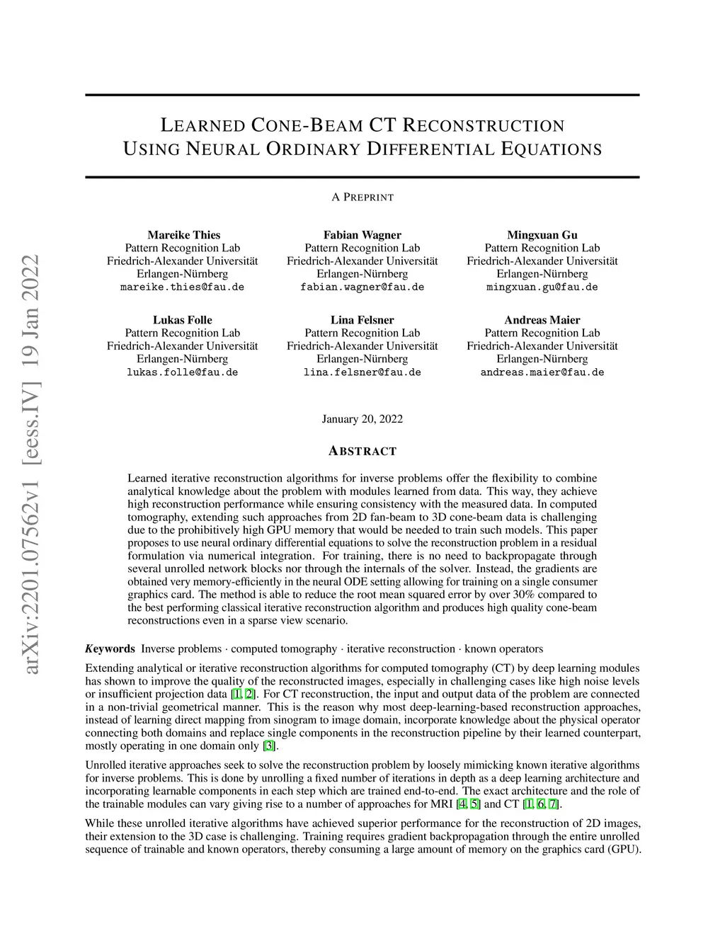 Learned iterative reconstruction algorithms for inverse problems offer the flexibility to combine analytical knowledge about the problem with modules learned from data. This way, they achieve high reconstruction performance while ensuring consistency with the measured data. In computed tomography, extending such approaches from 2D fan-beam to 3D cone-beam data is challenging due to the prohibitively high GPU memory that would be needed to train such models. This paper proposes to use neural ordinary differential equations to solve the reconstruction problem in a residual formulation via numerical integration. For training, there is no need to backpropagate through several unrolled network blocks nor through the internals of the solver. Instead, the gradients are obtained very memory-efficiently in the neural ODE setting allowing for training on a single consumer graphics card. The method is able to reduce the root mean squared error by over 30% compared to the best performing classical iterative reconstruction algorithm and produces high quality cone-beam reconstructions even in a sparse view scenario.