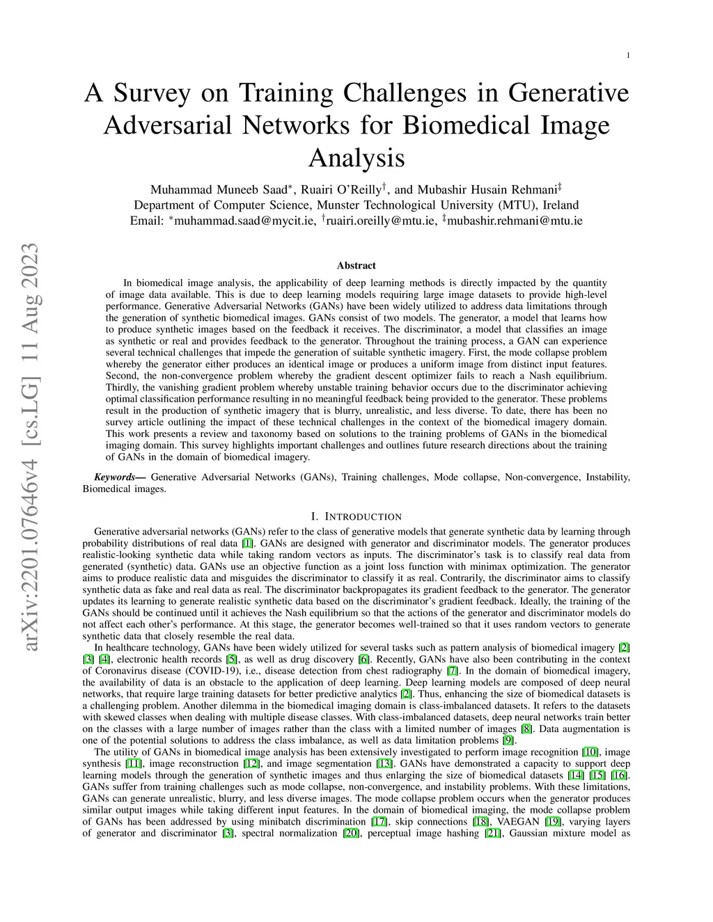 In biomedical image analysis, the applicability of deep learning methods is directly impacted by the quantity of image data available. This is due to deep learning models requiring large image datasets to provide high-level performance. Generative Adversarial Networks (GANs) have been widely utilized to address data limitations through the generation of synthetic biomedical images. GANs consist of two models. The generator, a model that learns how to produce synthetic images based on the feedback it receives. The discriminator, a model that classifies an image as synthetic or real and provides feedback to the generator. Throughout the training process, a GAN can experience several technical challenges that impede the generation of suitable synthetic imagery. First, the mode collapse problem whereby the generator either produces an identical image or produces a uniform image from distinct input features. Second, the non-convergence problem whereby the gradient descent optimizer fails to reach a Nash equilibrium. Thirdly, the vanishing gradient problem whereby unstable training behavior occurs due to the discriminator achieving optimal classification performance resulting in no meaningful feedback being provided to the generator. These problems result in the production of synthetic imagery that is blurry, unrealistic, and less diverse. To date, there has been no survey article outlining the impact of these technical challenges in the context of the biomedical imagery domain. This work presents a review and taxonomy based on solutions to the training problems of GANs in the biomedical imaging domain. This survey highlights important challenges and outlines future research directions about the training of GANs in the domain of biomedical imagery.