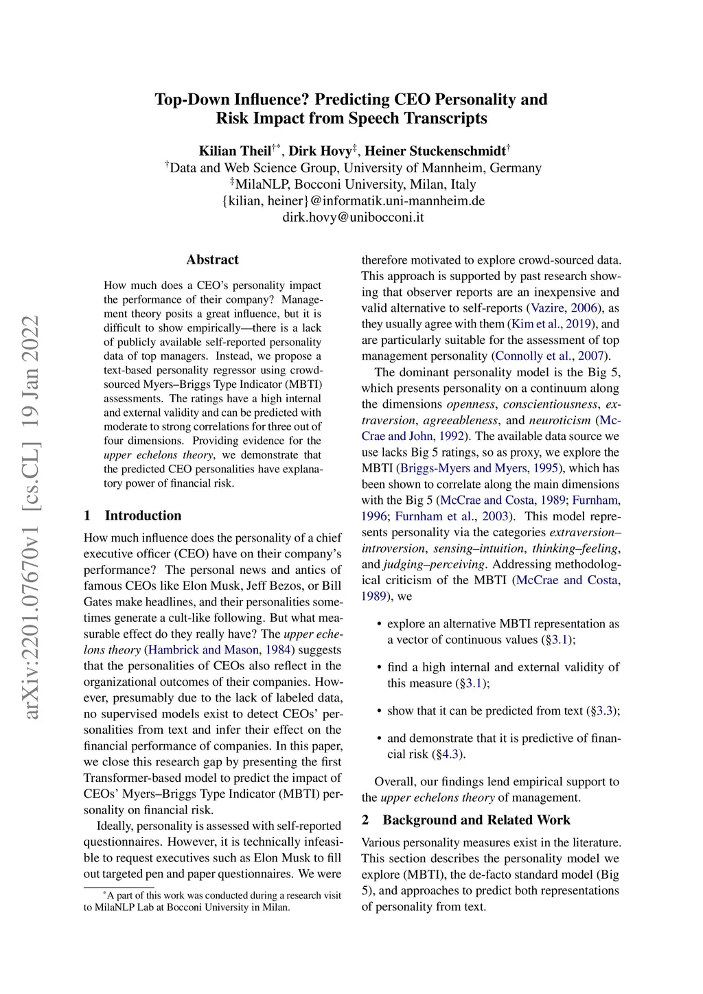 How much does a CEO's personality impact the performance of their company? Management theory posits a great influence, but it is difficult to show empirically -- there is a lack of publicly available self-reported personality data of top managers. Instead, we propose a text-based personality regressor using crowd-sourced Myers--Briggs Type Indicator (MBTI) assessments. The ratings have a high internal and external validity and can be predicted with moderate to strong correlations for three out of four dimensions. Providing evidence for the upper echelons theory, we demonstrate that the predicted CEO personalities have explanatory power of financial risk.