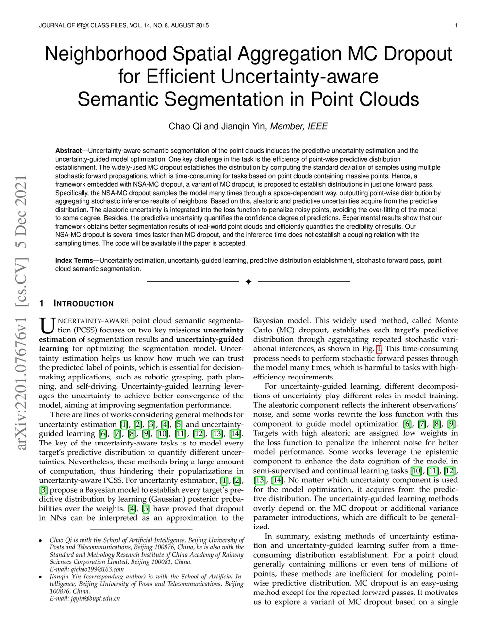 Uncertainty-aware semantic segmentation of the point clouds includes the predictive uncertainty estimation and the uncertainty-guided model optimization. One key challenge in the task is the efficiency of point-wise predictive distribution establishment. The widely-used MC dropout establishes the distribution by computing the standard deviation of samples using multiple stochastic forward propagations, which is time-consuming for tasks based on point clouds containing massive points. Hence, a framework embedded with NSA-MC dropout, a variant of MC dropout, is proposed to establish distributions in just one forward pass. Specifically, the NSA-MC dropout samples the model many times through a space-dependent way, outputting point-wise distribution by aggregating stochastic inference results of neighbors. Based on this, aleatoric and predictive uncertainties acquire from the predictive distribution. The aleatoric uncertainty is integrated into the loss function to penalize noisy points, avoiding the over-fitting of the model to some degree. Besides, the predictive uncertainty quantifies the confidence degree of predictions. Experimental results show that our framework obtains better segmentation results of real-world point clouds and efficiently quantifies the credibility of results. Our NSA-MC dropout is several times faster than MC dropout, and the inference time does not establish a coupling relation with the sampling times. The code will be available if the paper is accepted.