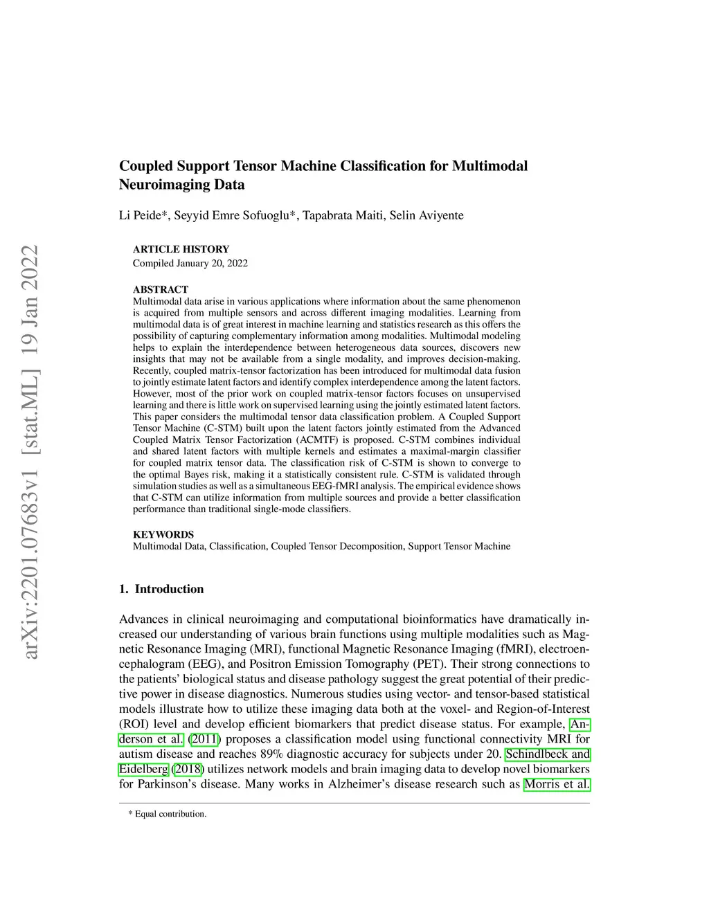 Multimodal data arise in various applications where information about the same phenomenon is acquired from multiple sensors and across different imaging modalities. Learning from multimodal data is of great interest in machine learning and statistics research as this offers the possibility of capturing complementary information among modalities. Multimodal modeling helps to explain the interdependence between heterogeneous data sources, discovers new insights that may not be available from a single modality, and improves decision-making. Recently, coupled matrix-tensor factorization has been introduced for multimodal data fusion to jointly estimate latent factors and identify complex interdependence among the latent factors. However, most of the prior work on coupled matrix-tensor factors focuses on unsupervised learning and there is little work on supervised learning using the jointly estimated latent factors. This paper considers the multimodal tensor data classification problem. A Coupled Support Tensor Machine (C-STM) built upon the latent factors jointly estimated from the Advanced Coupled Matrix Tensor Factorization (ACMTF) is proposed. C-STM combines individual and shared latent factors with multiple kernels and estimates a maximal-margin classifier for coupled matrix tensor data. The classification risk of C-STM is shown to converge to the optimal Bayes risk, making it a statistically consistent rule. C-STM is validated through simulation studies as well as a simultaneous EEG-fMRI analysis. The empirical evidence shows that C-STM can utilize information from multiple sources and provide a better classification performance than traditional single-mode classifiers.