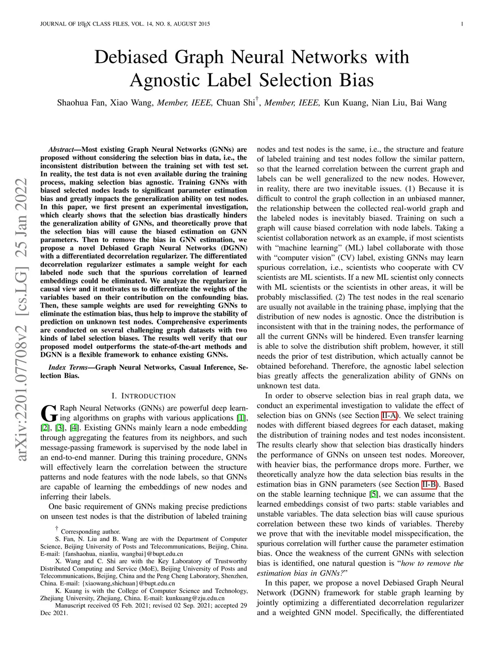 Most existing Graph Neural Networks (GNNs) are proposed without considering the selection bias in data, i.e., the inconsistent distribution between the training set with test set. In reality, the test data is not even available during the training process, making selection bias agnostic. Training GNNs with biased selected nodes leads to significant parameter estimation bias and greatly impacts the generalization ability on test nodes. In this paper, we first present an experimental investigation, which clearly shows that the selection bias drastically hinders the generalization ability of GNNs, and theoretically prove that the selection bias will cause the biased estimation on GNN parameters. Then to remove the bias in GNN estimation, we propose a novel Debiased Graph Neural Networks (DGNN) with a differentiated decorrelation regularizer. The differentiated decorrelation regularizer estimates a sample weight for each labeled node such that the spurious correlation of learned embeddings could be eliminated. We analyze the regularizer in causal view and it motivates us to differentiate the weights of the variables based on their contribution on the confounding bias. Then, these sample weights are used for reweighting GNNs to eliminate the estimation bias, thus help to improve the stability of prediction on unknown test nodes. Comprehensive experiments are conducted on several challenging graph datasets with two kinds of label selection biases. The results well verify that our proposed model outperforms the state-of-the-art methods and DGNN is a flexible framework to enhance existing GNNs.