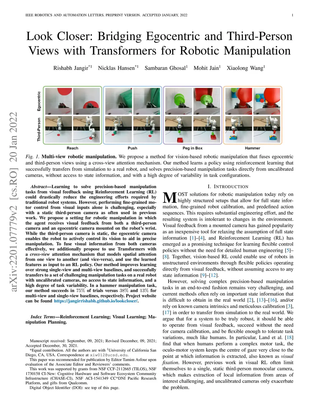 Learning to solve precision-based manipulation tasks from visual feedback using Reinforcement Learning (RL) could drastically reduce the engineering efforts required by traditional robot systems. However, performing fine-grained motor control from visual inputs alone is challenging, especially with a static third-person camera as often used in previous work. We propose a setting for robotic manipulation in which the agent receives visual feedback from both a third-person camera and an egocentric camera mounted on the robot's wrist. While the third-person camera is static, the egocentric camera enables the robot to actively control its vision to aid in precise manipulation. To fuse visual information from both cameras effectively, we additionally propose to use Transformers with a cross-view attention mechanism that models spatial attention from one view to another (and vice-versa), and use the learned features as input to an RL policy. Our method improves learning over strong single-view and multi-view baselines, and successfully transfers to a set of challenging manipulation tasks on a real robot with uncalibrated cameras, no access to state information, and a high degree of task variability. In a hammer manipulation task, our method succeeds in 75% of trials versus 38% and 13% for multi-view and single-view baselines, respectively.