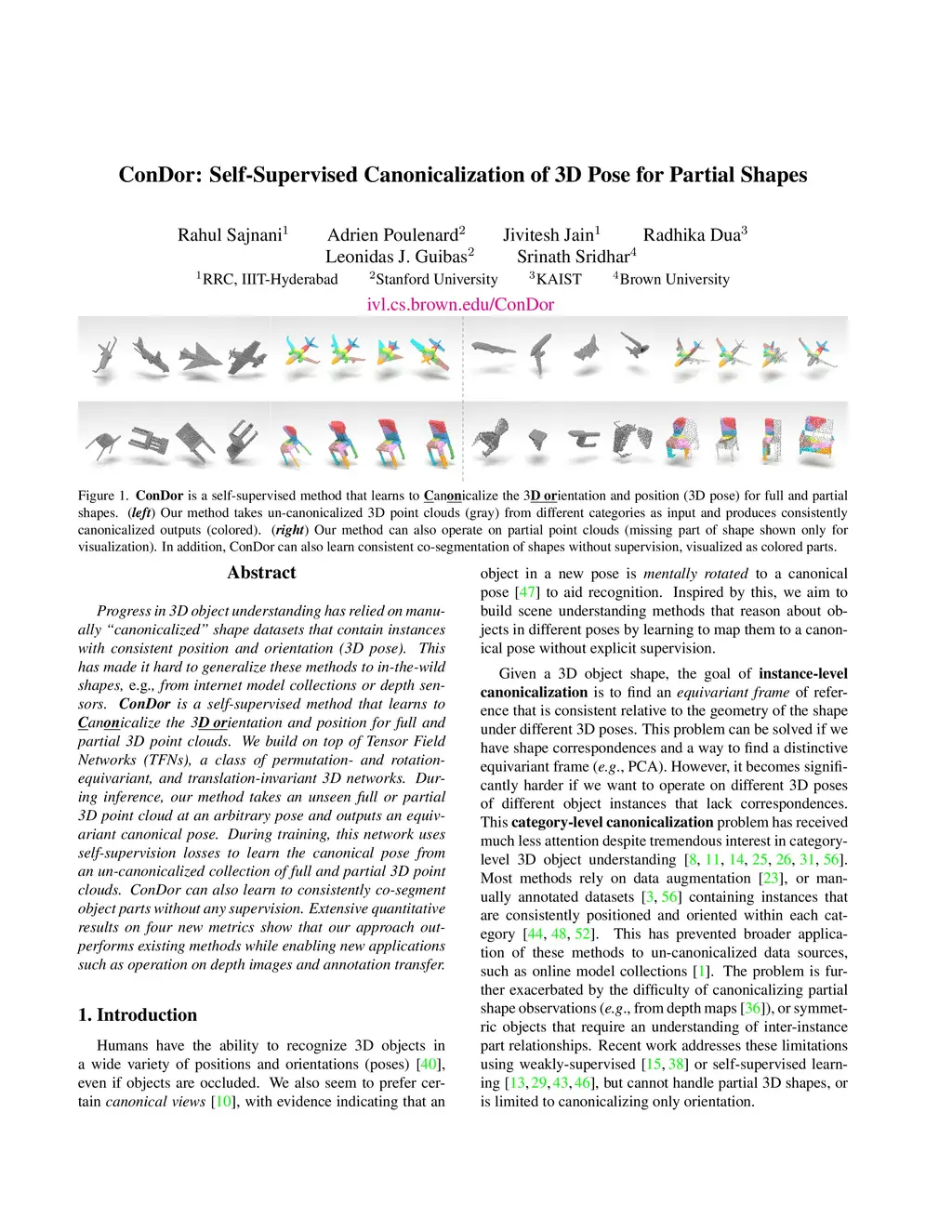 Progress in 3D object understanding has relied on manually canonicalized shape datasets that contain instances with consistent position and orientation (3D pose). This has made it hard to generalize these methods to in-the-wild shapes, eg., from internet model collections or depth sensors. ConDor is a self-supervised method that learns to Canonicalize the 3D orientation and position for full and partial 3D point clouds. We build on top of Tensor Field Networks (TFNs), a class of permutation- and rotation-equivariant, and translation-invariant 3D networks. During inference, our method takes an unseen full or partial 3D point cloud at an arbitrary pose and outputs an equivariant canonical pose. During training, this network uses self-supervision losses to learn the canonical pose from an un-canonicalized collection of full and partial 3D point clouds. ConDor can also learn to consistently co-segment object parts without any supervision. Extensive quantitative results on four new metrics show that our approach outperforms existing methods while enabling new applications such as operation on depth images and annotation transfer.