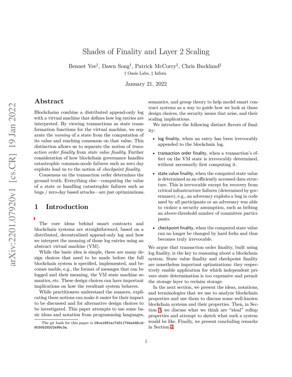 Blockchains combine a distributed append-only log with a virtual machine that defines how log entries are interpreted. By viewing transactions as state transformation functions for the virtual machine, we separate the naming of a state from the computation of its value and reaching consensus on that value. This distinction allows us to separate the notion of transaction order finality from state value finality. Further consideration of how blockchain governance handles catastrophic failures such as zero day exploits leads us to the notion of checkpoint finality. Consensus on the transaction order determines the ground truth. Everything else -- computing the value of a state or handling catastrophic failures such as bugs / zero-day based attacks -- are just optimizations.