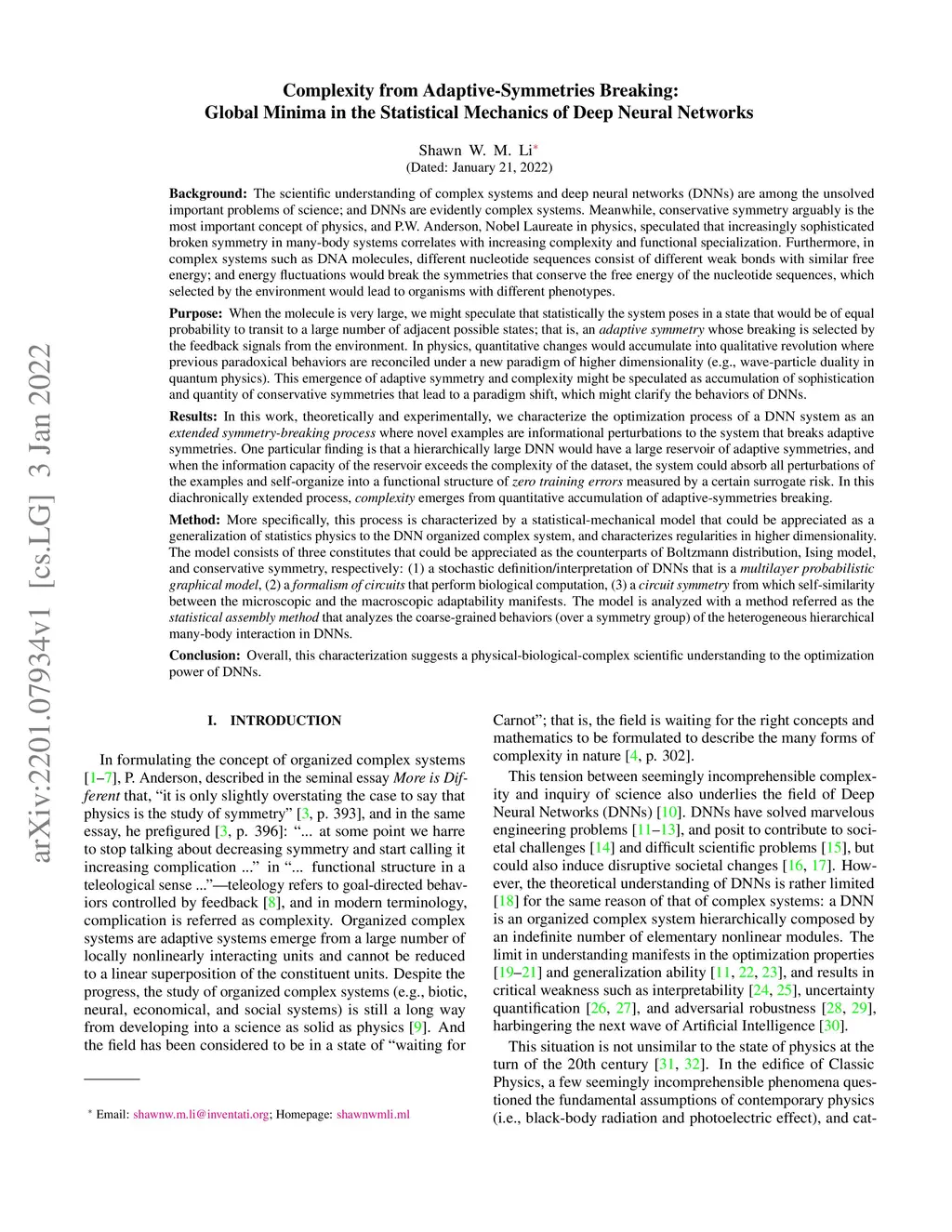 An antithetical concept, adaptive symmetry, to conservative symmetry in physics is proposed to understand the deep neural networks (DNNs). It characterizes the invariance of variance, where a biotic system explores different pathways of evolution with equal probability in absence of feedback signals, and complex functional structure emerges from quantitative accumulation of adaptive-symmetries breaking in response to feedback signals. Theoretically and experimentally, we characterize the optimization process of a DNN system as an extended adaptive-symmetry-breaking process. One particular finding is that a hierarchically large DNN would have a large reservoir of adaptive symmetries, and when the information capacity of the reservoir exceeds the complexity of the dataset, the system could absorb all perturbations of the examples and self-organize into a functional structure of zero training errors measured by a certain surrogate risk. More specifically, this process is characterized by a statistical-mechanical model that could be appreciated as a generalization of statistics physics to the DNN organized complex system, and characterizes regularities in higher dimensionality. The model consists of three constitutes that could be appreciated as the counterparts of Boltzmann distribution, Ising model, and conservative symmetry, respectively: (1) a stochastic definition/interpretation of DNNs that is a multilayer probabilistic graphical model, (2) a formalism of circuits that perform biological computation, (3) a circuit symmetry from which self-similarity between the microscopic and the macroscopic adaptability manifests. The model is analyzed with a method referred as the statistical assembly method that analyzes the coarse-grained behaviors (over a symmetry group) of the heterogeneous hierarchical many-body interaction in DNNs.