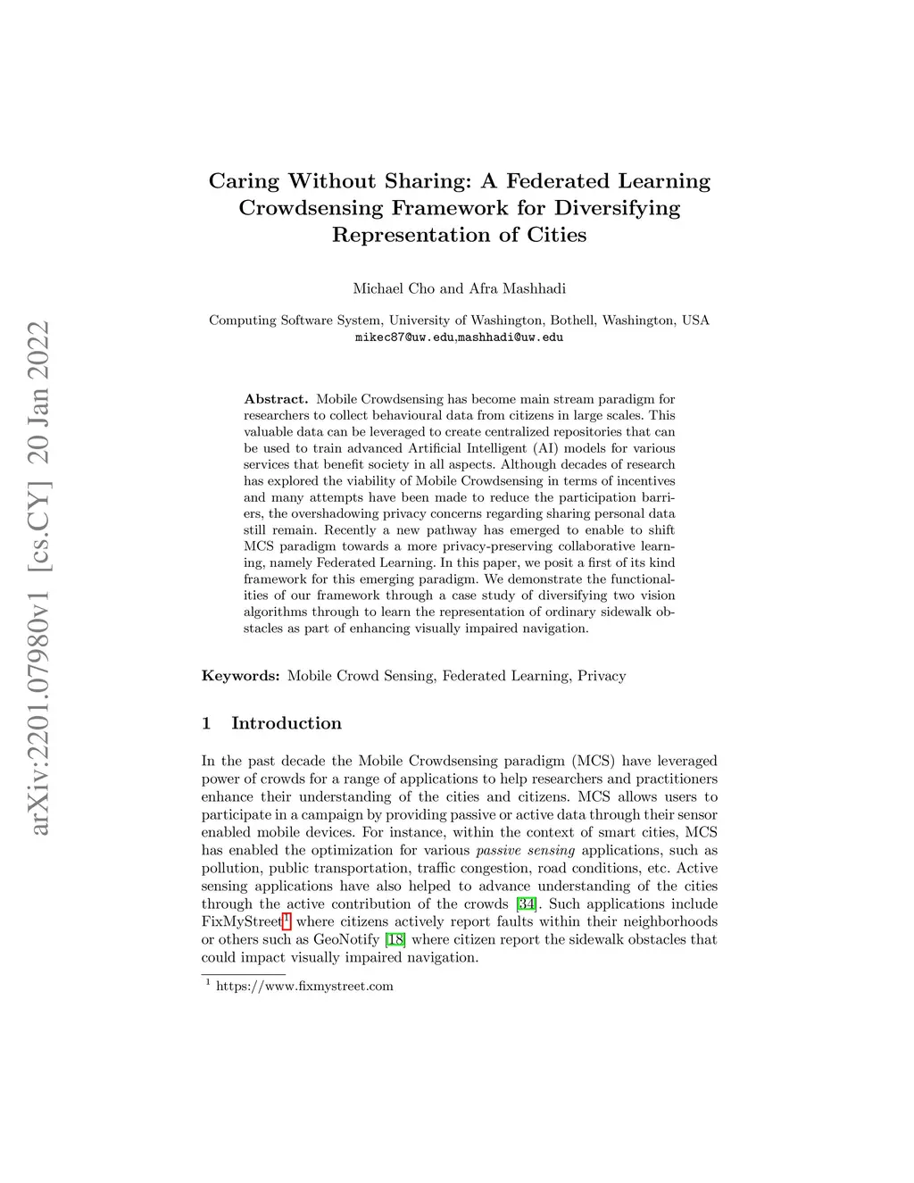 Mobile Crowdsensing has become main stream paradigm for researchers to collect behavioral data from citizens in large scales. This valuable data can be leveraged to create centralized repositories that can be used to train advanced Artificial Intelligent (AI) models for various services that benefit society in all aspects. Although decades of research has explored the viability of Mobile Crowdsensing in terms of incentives and many attempts have been made to reduce the participation barriers, the overshadowing privacy concerns regarding sharing personal data still remain. Recently a new pathway has emerged to enable to shift MCS paradigm towards a more privacy-preserving collaborative learning, namely Federated Learning. In this paper, we posit a first of its kind framework for this emerging paradigm. We demonstrate the functionalities of our framework through a case study of diversifying two vision algorithms through to learn the representation of ordinary sidewalk obstacles as part of enhancing visually impaired navigation.