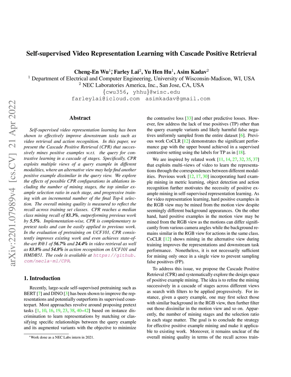 Self-supervised video representation learning has been shown to effectively improve downstream tasks such as video retrieval and action recognition. In this paper, we present the Cascade Positive Retrieval (CPR) that successively mines positive examples w.r.t. the query for contrastive learning in a cascade of stages. Specifically, CPR exploits multiple views of a query example in different modalities, where an alternative view may help find another positive example dissimilar in the query view. We explore the effects of possible CPR configurations in ablations including the number of mining stages, the top similar example selection ratio in each stage, and progressive training with an incremental number of the final Top-k selection. The overall mining quality is measured to reflect the recall across training set classes. CPR reaches a median class mining recall of 83.3%, outperforming previous work by 5.5%. Implementation-wise, CPR is complementary to pretext tasks and can be easily applied to previous work. In the evaluation of pretraining on UCF101, CPR consistently improves existing work and even achieves state-of-the-art R@1 of 56.7% and 24.4% in video retrieval as well as 83.8% and 54.8% in action recognition on UCF101 and HMDB51. The code is available at https://github.com/necla-ml/CPR.