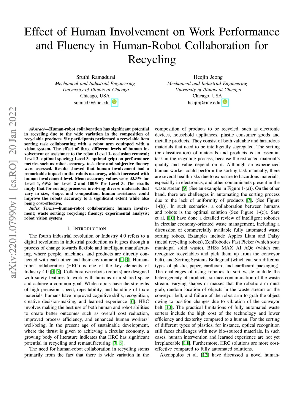 Human-robot collaboration has significant potential in recycling due to the wide variation in the composition of recyclable products. Six participants performed a recyclable item sorting task collaborating with a robot arm equipped with a vision system. The effect of three different levels of human involvement or assistance to the robot (Level 1- occlusion removal; Level 2- optimal spacing; Level 3- optimal grip) on performance metrics such as robot accuracy, task time and subjective fluency were assessed. Results showed that human involvement had a remarkable impact on the robot's accuracy, which increased with human involvement level. Mean accuracy values were 33.3% for Level 1, 69% for Level 2 and 100% for Level 3. The results imply that for sorting processes involving diverse materials that vary in size, shape, and composition, human assistance could improve the robot's accuracy to a significant extent while also being cost-effective.