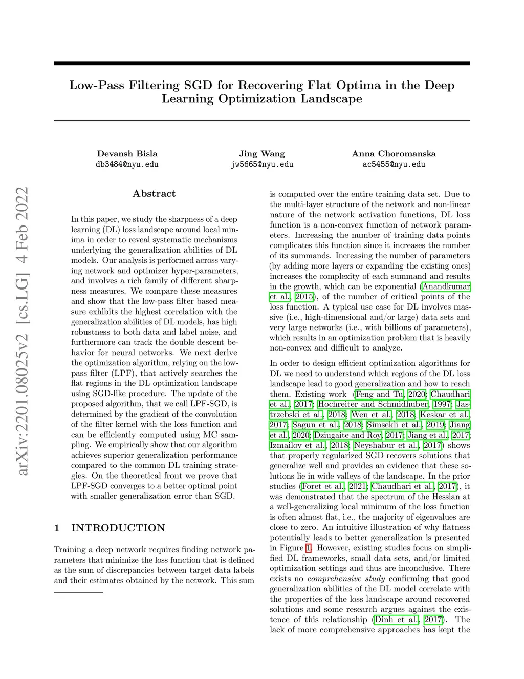 In this paper, we study the sharpness of a deep learning (DL) loss landscape around local minima in order to reveal systematic mechanisms underlying the generalization abilities of DL models. Our analysis is performed across varying network and optimizer hyper-parameters, and involves a rich family of different sharpness measures. We compare these measures and show that the low-pass filter-based measure exhibits the highest correlation with the generalization abilities of DL models, has high robustness to both data and label noise, and furthermore can track the double descent behavior for neural networks. We next derive the optimization algorithm, relying on the low-pass filter (LPF), that actively searches the flat regions in the DL optimization landscape using SGD-like procedure. The update of the proposed algorithm, that we call LPF-SGD, is determined by the gradient of the convolution of the filter kernel with the loss function and can be efficiently computed using MC sampling. We empirically show that our algorithm achieves superior generalization performance compared to the common DL training strategies. On the theoretical front, we prove that LPF-SGD converges to a better optimal point with smaller generalization error than SGD.