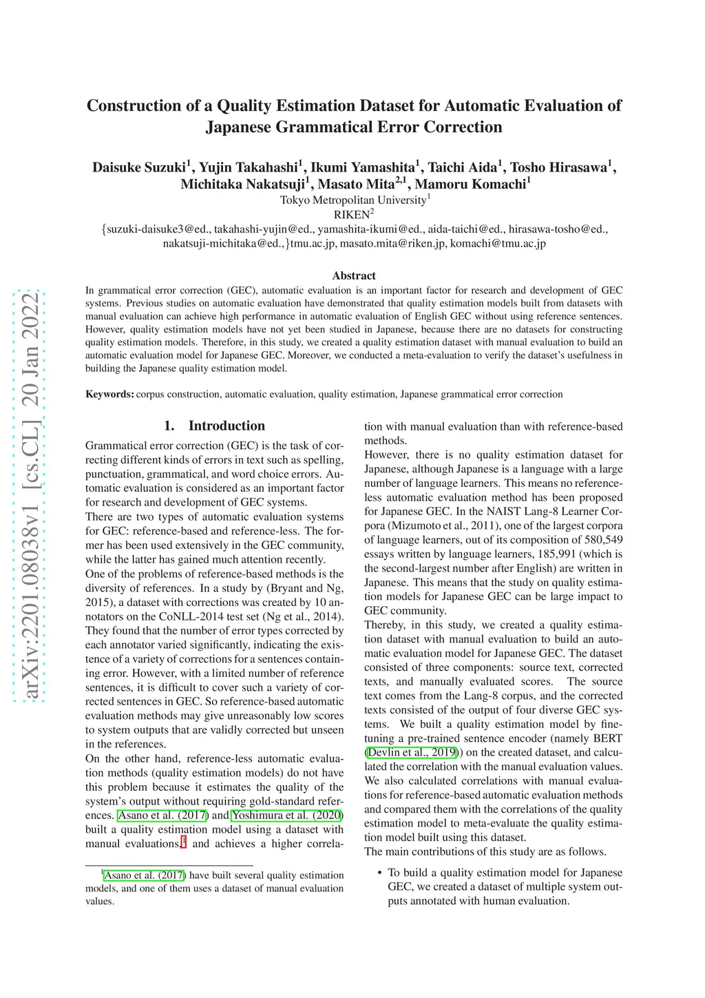 Construction of a Quality Estimation Dataset for Automatic Evaluation of