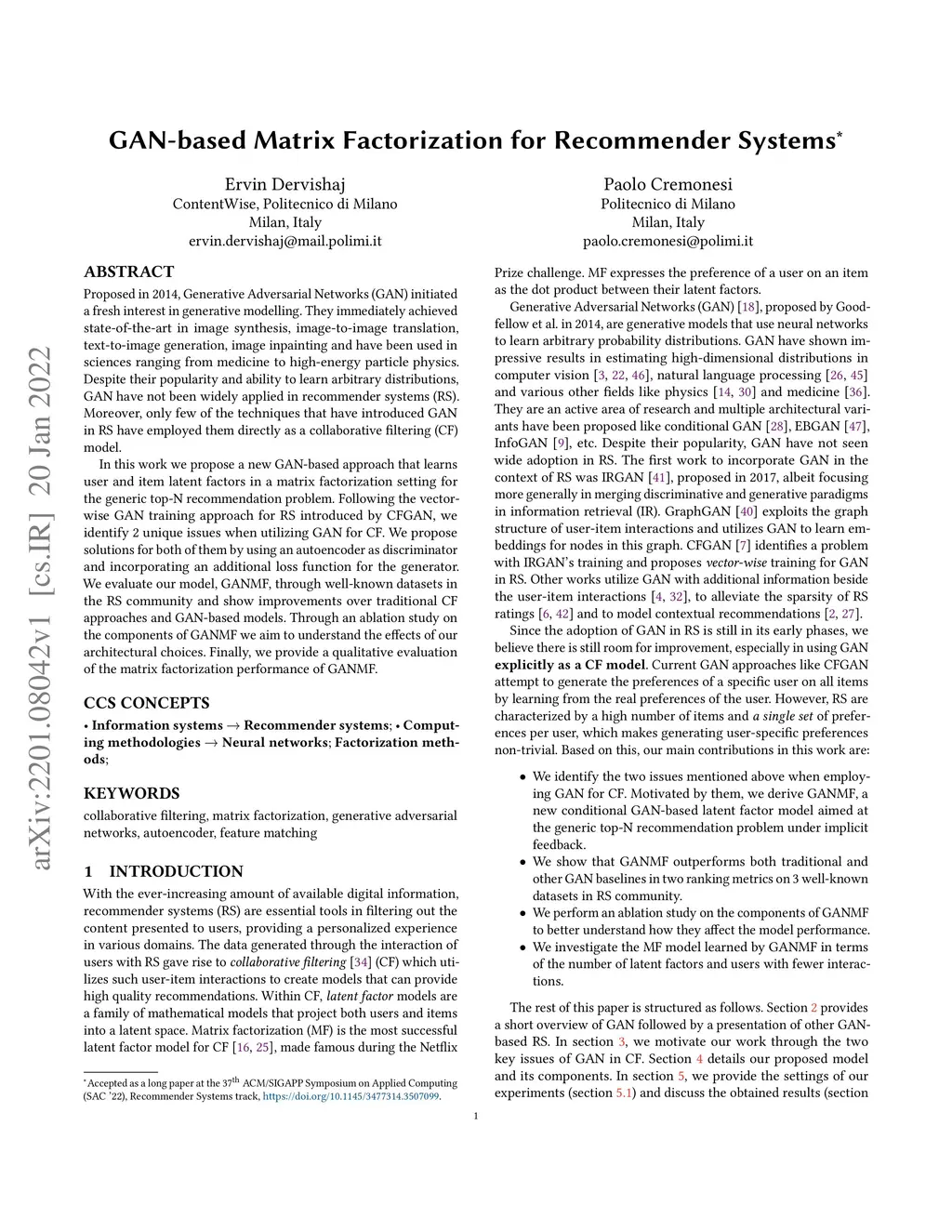 Proposed in 2014, Generative Adversarial Networks (GAN) initiated a fresh interest in generative modelling. They immediately achieved state-of-the-art in image synthesis, image-to-image translation, text-to-image generation, image inpainting and have been used in sciences ranging from medicine to high-energy particle physics. Despite their popularity and ability to learn arbitrary distributions, GAN have not been widely applied in recommender systems (RS). Moreover, only few of the techniques that have introduced GAN in RS have employed them directly as a collaborative filtering (CF) model. In this work we propose a new GAN-based approach that learns user and item latent factors in a matrix factorization setting for the generic top-N recommendation problem. Following the vector-wise GAN training approach for RS introduced by CFGAN, we identify 2 unique issues when utilizing GAN for CF. We propose solutions for both of them by using an autoencoder as discriminator and incorporating an additional loss function for the generator. We evaluate our model, GANMF, through well-known datasets in the RS community and show improvements over traditional CF approaches and GAN-based models. Through an ablation study on the components of GANMF we aim to understand the effects of our architectural choices. Finally, we provide a qualitative evaluation of the matrix factorization performance of GANMF.