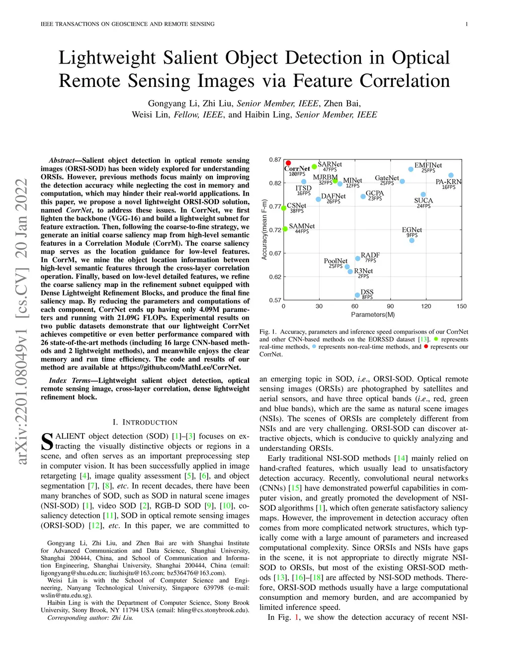 Salient object detection in optical remote sensing images (ORSI-SOD) has been widely explored for understanding ORSIs. However, previous methods focus mainly on improving the detection accuracy while neglecting the cost in memory and computation, which may hinder their real-world applications. In this paper, we propose a novel lightweight ORSI-SOD solution, named CorrNet, to address these issues. In CorrNet, we first lighten the backbone (VGG-16) and build a lightweight subnet for feature extraction. Then, following the coarse-to-fine strategy, we generate an initial coarse saliency map from high-level semantic features in a Correlation Module (CorrM). The coarse saliency map serves as the location guidance for low-level features. In CorrM, we mine the object location information between high-level semantic features through the cross-layer correlation operation. Finally, based on low-level detailed features, we refine the coarse saliency map in the refinement subnet equipped with Dense Lightweight Refinement Blocks, and produce the final fine saliency map. By reducing the parameters and computations of each component, CorrNet ends up having only 4.09M parameters and running with 21.09G FLOPs. Experimental results on two public datasets demonstrate that our lightweight CorrNet achieves competitive or even better performance compared with 26 state-of-the-art methods (including 16 large CNN-based methods and 2 lightweight methods), and meanwhile enjoys the clear memory and run time efficiency. The code and results of our method are available at https://github.com/MathLee/CorrNet.
