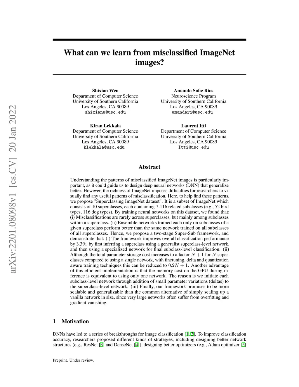 Understanding the patterns of misclassified ImageNet images is particularly important, as it could guide us to design deep neural networks (DNN) that generalize better. However, the richness of ImageNet imposes difficulties for researchers to visually find any useful patterns of misclassification. Here, to help find these patterns, we propose "Superclassing ImageNet dataset". It is a subset of ImageNet which consists of 10 superclasses, each containing 7-116 related subclasses (e.g., 52 bird types, 116 dog types). By training neural networks on this dataset, we found that: (i) Misclassifications are rarely across superclasses, but mainly among subclasses within a superclass. (ii) Ensemble networks trained each only on subclasses of a given superclass perform better than the same network trained on all subclasses of all superclasses. Hence, we propose a two-stage Super-Sub framework, and demonstrate that: (i) The framework improves overall classification performance by 3.3%, by first inferring a superclass using a generalist superclass-level network, and then using a specialized network for final subclass-level classification. (ii) Although the total parameter storage cost increases to a factor N+1 for N superclasses compared to using a single network, with finetuning, delta and quantization aware training techniques this can be reduced to 0.2N+1. Another advantage of this efficient implementation is that the memory cost on the GPU during inference is equivalent to using only one network. The reason is we initiate each subclass-level network through addition of small parameter variations (deltas) to the superclass-level network. (iii) Finally, our framework promises to be more scalable and generalizable than the common alternative of simply scaling up a vanilla network in size, since very large networks often suffer from overfitting and gradient vanishing.