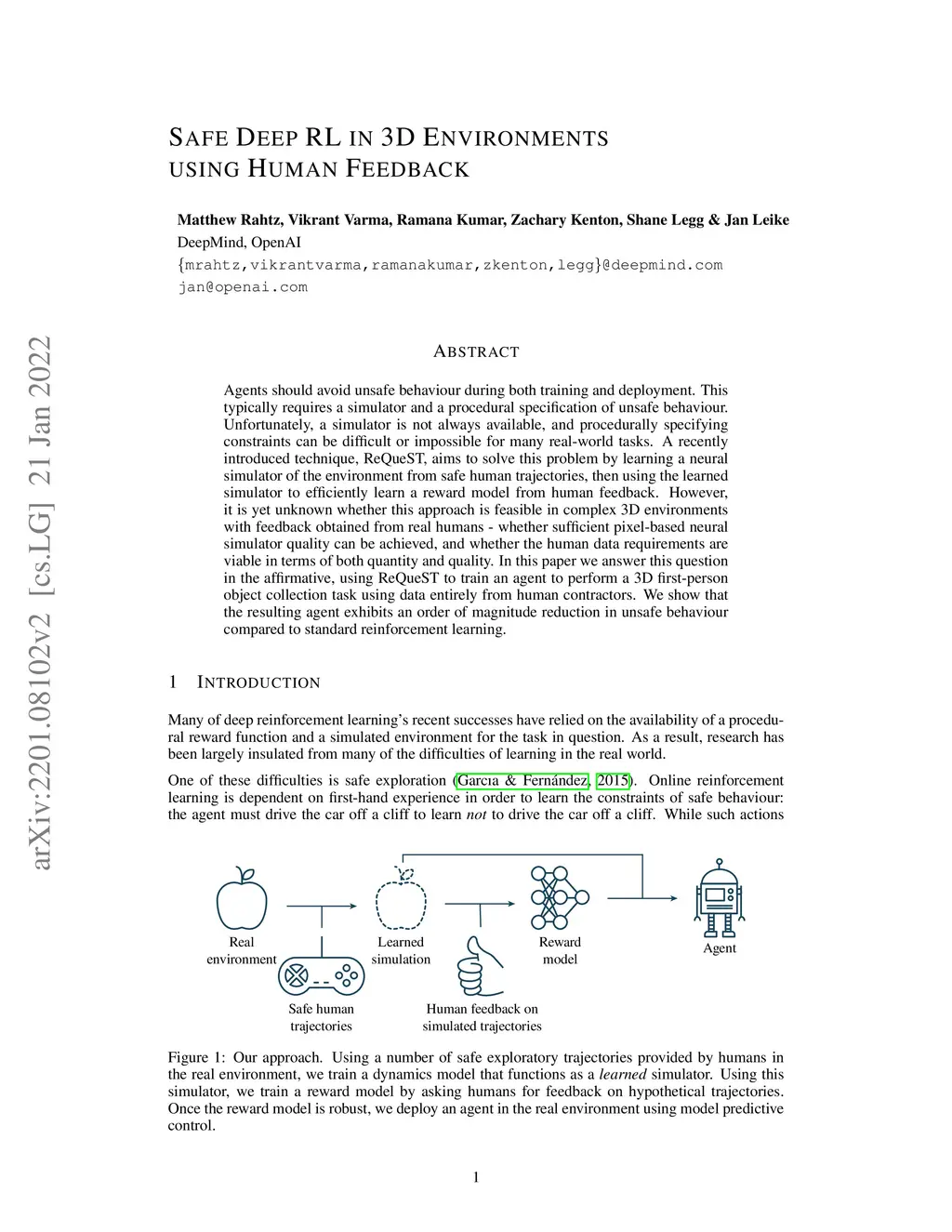 Agents should avoid unsafe behaviour during both training and deployment. This typically requires a simulator and a procedural specification of unsafe behaviour. Unfortunately, a simulator is not always available, and procedurally specifying constraints can be difficult or impossible for many real-world tasks. A recently introduced technique, ReQueST, aims to solve this problem by learning a neural simulator of the environment from safe human trajectories, then using the learned simulator to efficiently learn a reward model from human feedback. However, it is yet unknown whether this approach is feasible in complex 3D environments with feedback obtained from real humans - whether sufficient pixel-based neural simulator quality can be achieved, and whether the human data requirements are viable in terms of both quantity and quality. In this paper we answer this question in the affirmative, using ReQueST to train an agent to perform a 3D first-person object collection task using data entirely from human contractors. We show that the resulting agent exhibits an order of magnitude reduction in unsafe behaviour compared to standard reinforcement learning.