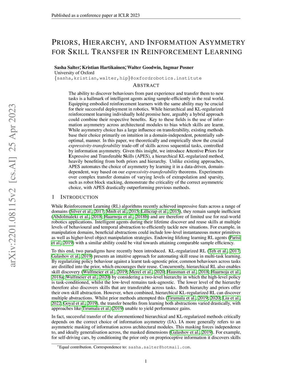 The ability to discover behaviours from past experience and transfer them to new tasks is a hallmark of intelligent agents acting sample-efficiently in the real world. Equipping embodied reinforcement learners with the same ability may be crucial for their successful deployment in robotics. While hierarchical and KL-regularized reinforcement learning individually hold promise here, arguably a hybrid approach could combine their respective benefits. Key to these fields is the use of information asymmetry across architectural modules to bias which skills are learnt. While asymmetry choice has a large influence on transferability, existing methods base their choice primarily on intuition in a domain-independent, potentially sub-optimal, manner. In this paper, we theoretically and empirically show the crucial expressivity-transferability trade-off of skills across sequential tasks, controlled by information asymmetry. Given this insight, we introduce Attentive Priors for Expressive and Transferable Skills (APES), a hierarchical KL-regularized method, heavily benefiting from both priors and hierarchy. Unlike existing approaches, APES automates the choice of asymmetry by learning it in a data-driven, domain-dependent, way based on our expressivity-transferability theorems. Experiments over complex transfer domains of varying levels of extrapolation and sparsity, such as robot block stacking, demonstrate the criticality of the correct asymmetric choice, with APES drastically outperforming previous methods.