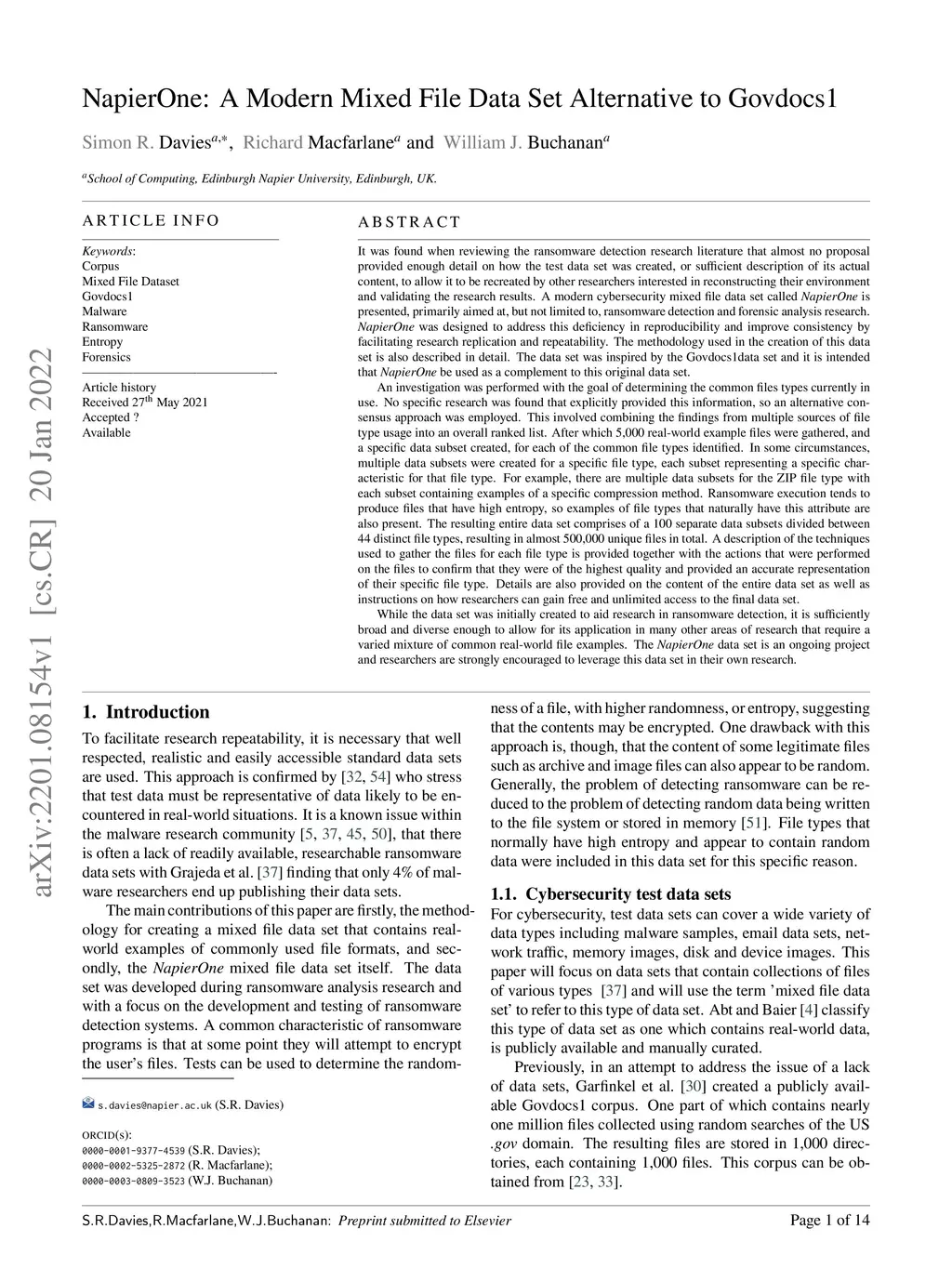 NapierOne: A modern mixed file data set alternative to Govdocs1