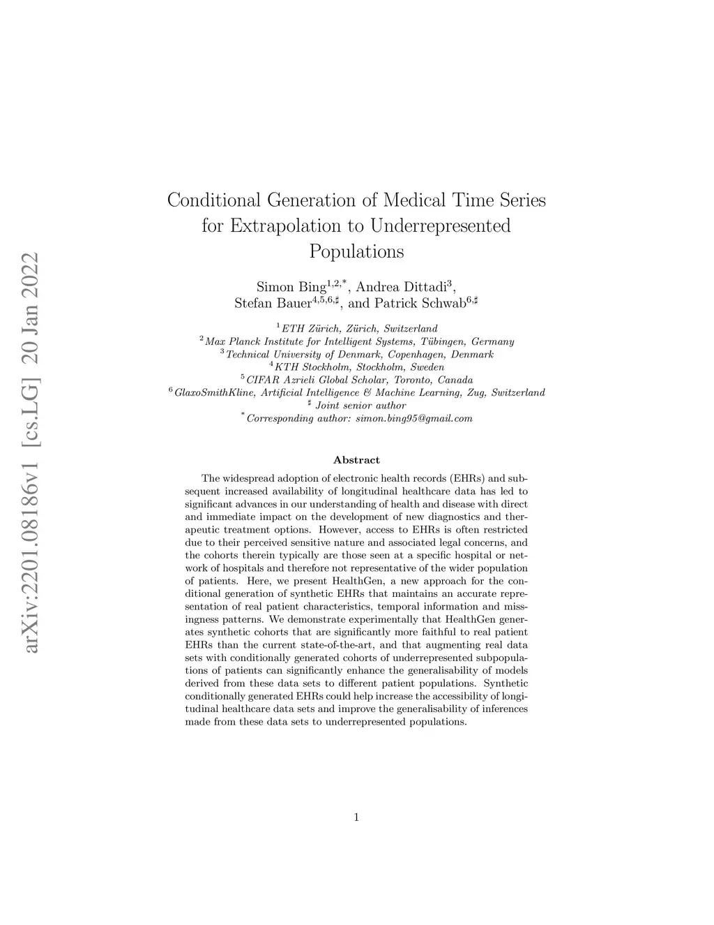 The widespread adoption of electronic health records (EHRs) and subsequent increased availability of longitudinal healthcare data has led to significant advances in our understanding of health and disease with direct and immediate impact on the development of new diagnostics and therapeutic treatment options. However, access to EHRs is often restricted due to their perceived sensitive nature and associated legal concerns, and the cohorts therein typically are those seen at a specific hospital or network of hospitals and therefore not representative of the wider population of patients. Here, we present HealthGen, a new approach for the conditional generation of synthetic EHRs that maintains an accurate representation of real patient characteristics, temporal information and missingness patterns. We demonstrate experimentally that HealthGen generates synthetic cohorts that are significantly more faithful to real patient EHRs than the current state-of-the-art, and that augmenting real data sets with conditionally generated cohorts of underrepresented subpopulations of patients can significantly enhance the generalisability of models derived from these data sets to different patient populations. Synthetic conditionally generated EHRs could help increase the accessibility of longitudinal healthcare data sets and improve the generalisability of inferences made from these data sets to underrepresented populations.