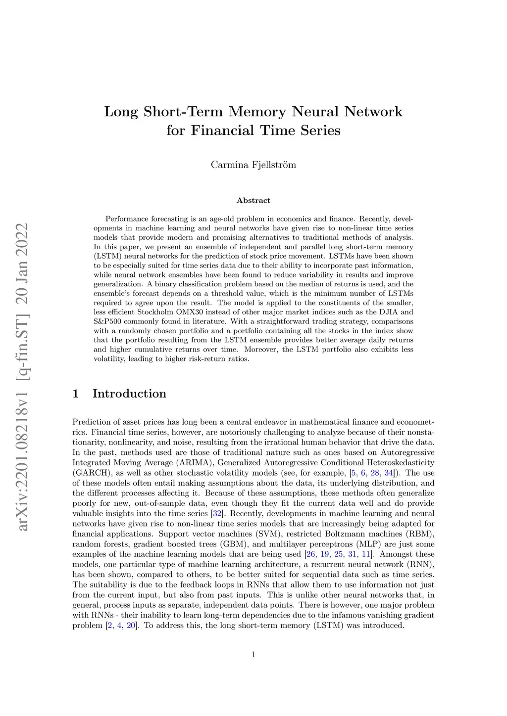 Performance forecasting is an age-old problem in economics and finance. Recently, developments in machine learning and neural networks have given rise to non-linear time series models that provide modern and promising alternatives to traditional methods of analysis. In this paper, we present an ensemble of independent and parallel long short-term memory (LSTM) neural networks for the prediction of stock price movement. LSTMs have been shown to be especially suited for time series data due to their ability to incorporate past information, while neural network ensembles have been found to reduce variability in results and improve generalization. A binary classification problem based on the median of returns is used, and the ensemble's forecast depends on a threshold value, which is the minimum number of LSTMs required to agree upon the result. The model is applied to the constituents of the smaller, less efficient Stockholm OMX30 instead of other major market indices such as the DJIA and S&P500 commonly found in literature. With a straightforward trading strategy, comparisons with a randomly chosen portfolio and a portfolio containing all the stocks in the index show that the portfolio resulting from the LSTM ensemble provides better average daily returns and higher cumulative returns over time. Moreover, the LSTM portfolio also exhibits less volatility, leading to higher risk-return ratios.