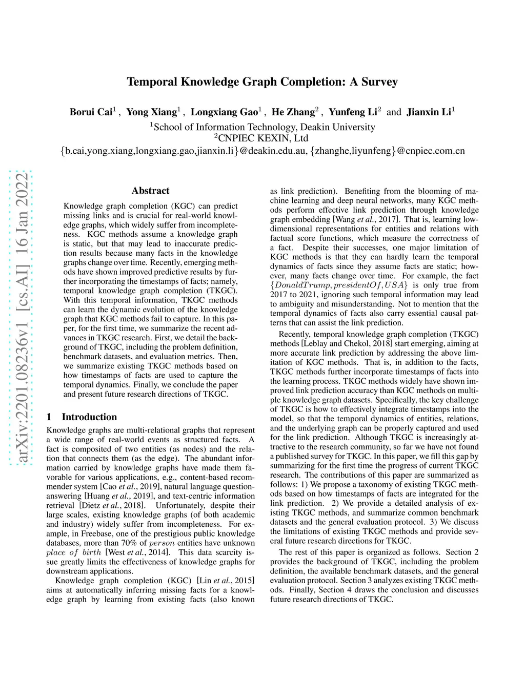 Knowledge graph completion (KGC) can predict missing links and is crucial for real-world knowledge graphs, which widely suffer from incompleteness. KGC methods assume a knowledge graph is static, but that may lead to inaccurate prediction results because many facts in the knowledge graphs change over time. Recently, emerging methods have shown improved predictive results by further incorporating the timestamps of facts; namely, temporal knowledge graph completion (TKGC). With this temporal information, TKGC methods can learn the dynamic evolution of the knowledge graph that KGC methods fail to capture. In this paper, for the first time, we summarize the recent advances in TKGC research. First, we detail the background of TKGC, including the problem definition, benchmark datasets, and evaluation metrics. Then, we summarize existing TKGC methods based on how timestamps of facts are used to capture the temporal dynamics. Finally, we conclude the paper and present future research directions of TKGC.
