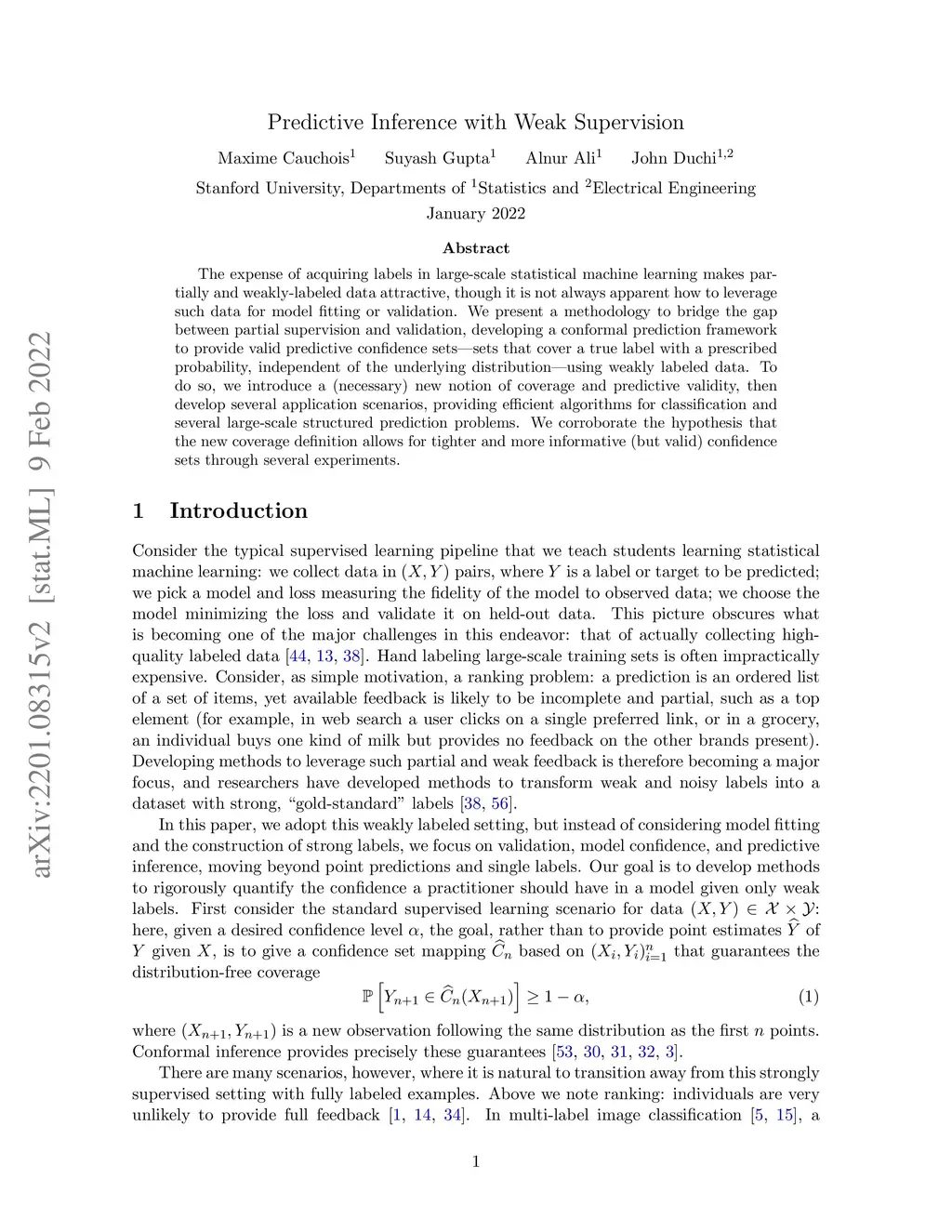The expense of acquiring labels in large-scale statistical machine learning makes partially and weakly-labeled data attractive, though it is not always apparent how to leverage such data for model fitting or validation. We present a methodology to bridge the gap between partial supervision and validation, developing a conformal prediction framework to provide valid predictive confidence sets -- sets that cover a true label with a prescribed probability, independent of the underlying distribution -- using weakly labeled data. To do so, we introduce a (necessary) new notion of coverage and predictive validity, then develop several application scenarios, providing efficient algorithms for classification and several large-scale structured prediction problems. We corroborate the hypothesis that the new coverage definition allows for tighter and more informative (but valid) confidence sets through several experiments.
