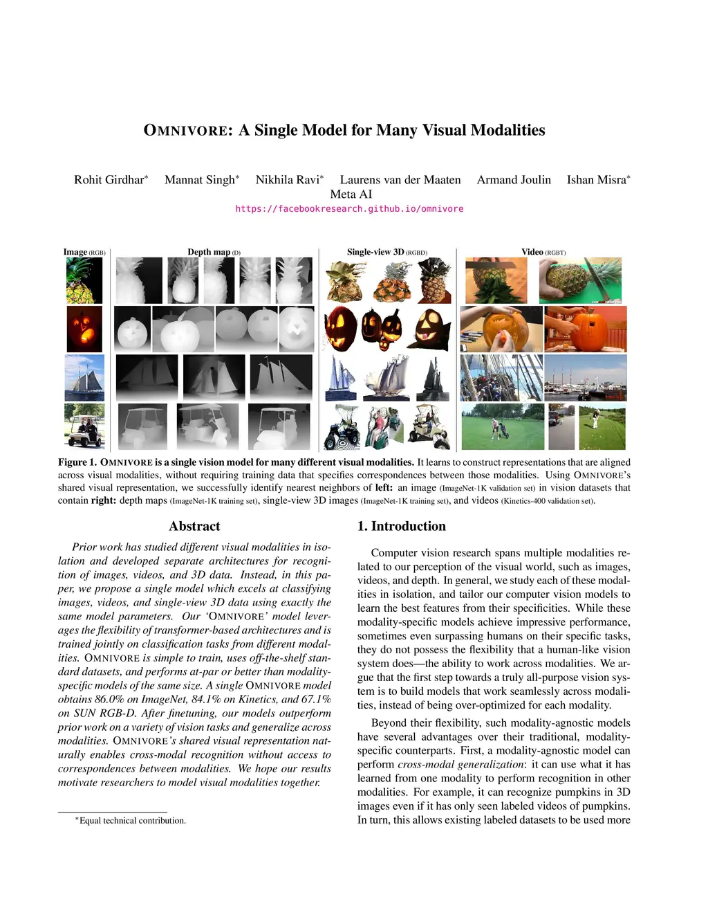 Prior work has studied different visual modalities in isolation and developed separate architectures for recognition of images, videos, and 3D data. Instead, in this paper, we propose a single model which excels at classifying images, videos, and single-view 3D data using exactly the same model parameters. Our Ómnivore' model leverages the flexibility of transformer-based architectures and is trained jointly on classification tasks from different modalities. Omnivore is simple to train, uses off-the-shelf standard datasets, and performs at-par or better than modality-specific models of the same size. A single Omnivore model obtains 86.0% on ImageNet, 84.1% on Kinetics, and 67.1% on SUN RGB-D. After finetuning, our models outperform prior work on a variety of vision tasks and generalize across modalities. Omnivore's shared visual representation naturally enables cross-modal recognition without access to correspondences between modalities. We hope our results motivate researchers to model visual modalities together.
