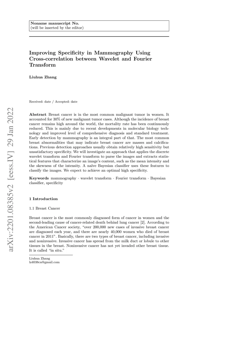 Breast cancer is in the most common malignant tumor in women. It accounted for 30% of new malignant tumor cases. Although the incidence of breast cancer remains high around the world, the mortality rate has been continuously reduced. This is mainly due to recent developments in molecular biology technology and improved level of comprehensive diagnosis and standard treatment. Early detection by mammography is an integral part of that. The most common breast abnormalities that may indicate breast cancer are masses and calcifications. Previous detection approaches usually obtain relatively high sensitivity but unsatisfactory specificity. We will investigate an approach that applies the discrete wavelet transform and Fourier transform to parse the images and extracts statistical features that characterize an image's content, such as the mean intensity and the skewness of the intensity. A naive Bayesian classifier uses these features to classify the images. We expect to achieve an optimal high specificity.