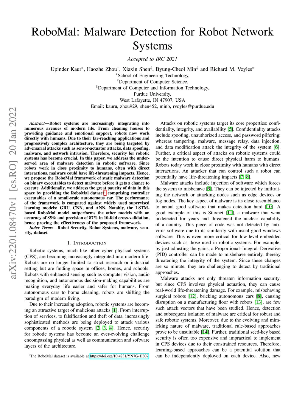 Robot systems are increasingly integrating into numerous avenues of modern life. From cleaning houses to providing guidance and emotional support, robots now work directly with humans. Due to their far-reaching applications and progressively complex architecture, they are being targeted by adversarial attacks such as sensor-actuator attacks, data spoofing, malware, and network intrusion. Therefore, security for robotic systems has become crucial. In this paper, we address the underserved area of malware detection in robotic software. Since robots work in close proximity to humans, often with direct interactions, malware could have life-threatening impacts. Hence, we propose the RoboMal framework of static malware detection on binary executables to detect malware before it gets a chance to execute. Additionally, we address the great paucity of data in this space by providing the RoboMal dataset comprising controller executables of a small-scale autonomous car. The performance of the framework is compared against widely used supervised learning models: GRU, CNN, and ANN. Notably, the LSTM-based RoboMal model outperforms the other models with an accuracy of 85% and precision of 87% in 10-fold cross-validation, hence proving the effectiveness of the proposed framework.
