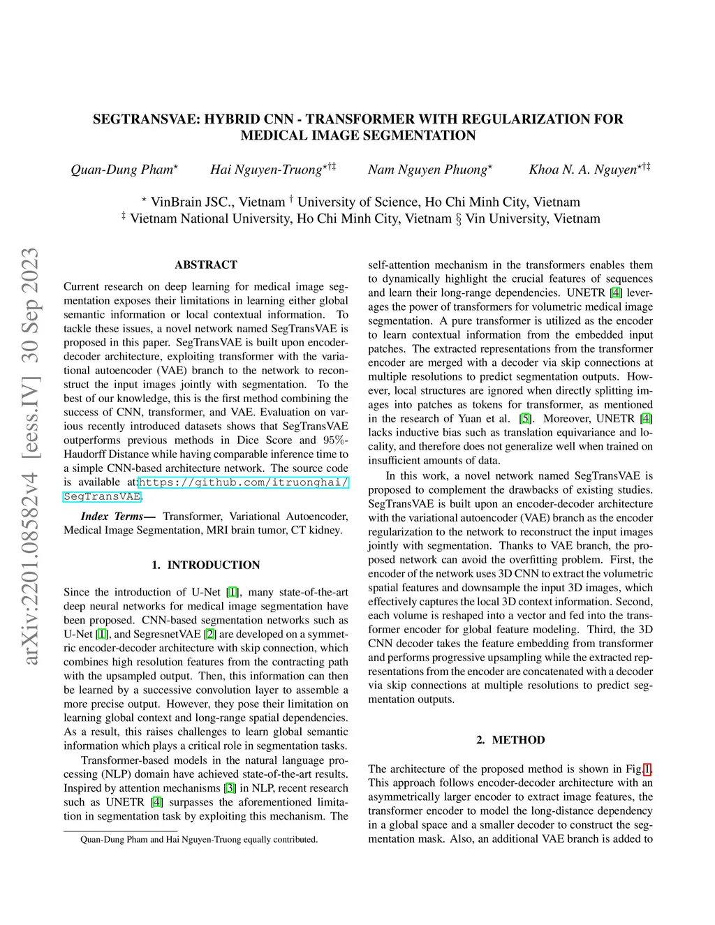SegTransVAE: Hybrid CNN -- Transformer with Regularization for medical