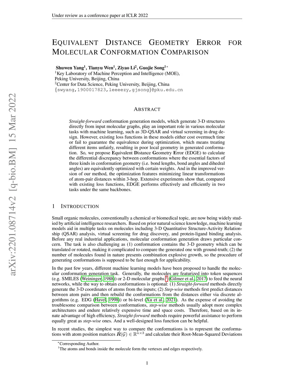 Straight-forward conformation generation models, which generate 3-D structures directly from input molecular graphs, play an important role in various molecular tasks with machine learning, such as 3D-QSAR and virtual screening in drug design. However, existing loss functions in these models either cost overmuch time or fail to guarantee the equivalence during optimization, which means treating different items unfairly, resulting in poor local geometry in generated conformation. So, we propose Equivalent Distance Geometry Error (EDGE) to calculate the differential discrepancy between conformations where the essential factors of three kinds in conformation geometry (i.e. bond lengths, bond angles and dihedral angles) are equivalently optimized with certain weights. And in the improved version of our method, the optimization features minimizing linear transformations of atom-pair distances within 3-hop. Extensive experiments show that, compared with existing loss functions, EDGE performs effectively and efficiently in two tasks under the same backbones.