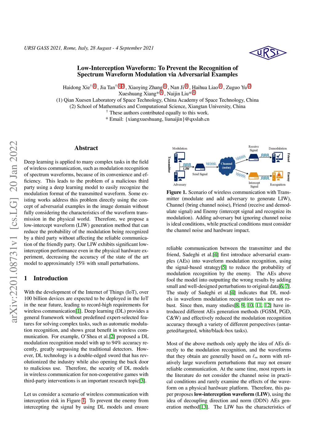 Deep learning is applied to many complex tasks in the field of wireless communication, such as modulation recognition of spectrum waveforms, because of its convenience and efficiency. This leads to the problem of a malicious third party using a deep learning model to easily recognize the modulation format of the transmitted waveform. Some existing works address this problem directly using the concept of adversarial examples in the image domain without fully considering the characteristics of the waveform transmission in the physical world. Therefore, we propose a low-intercept waveform~(LIW) generation method that can reduce the probability of the modulation being recognized by a third party without affecting the reliable communication of the friendly party. Our LIW exhibits significant low-interception performance even in the physical hardware experiment, decreasing the accuracy of the state of the art model to approximately with small perturbations.