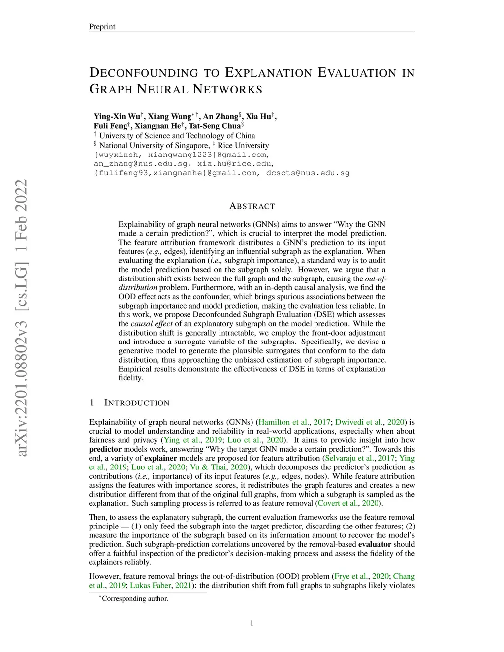 Explainability of graph neural networks (GNNs) aims to answer "Why the GNN made a certain prediction?", which is crucial to interpret the model prediction. The feature attribution framework distributes a GNN's prediction to its input features (e.g., edges), identifying an influential subgraph as the explanation. When evaluating the explanation (i.e., subgraph importance), a standard way is to audit the model prediction based on the subgraph solely. However, we argue that a distribution shift exists between the full graph and the subgraph, causing the out-of-distribution problem. Furthermore, with an in-depth causal analysis, we find the OOD effect acts as the confounder, which brings spurious associations between the subgraph importance and model prediction, making the evaluation less reliable. In this work, we propose Deconfounded Subgraph Evaluation (DSE) which assesses the causal effect of an explanatory subgraph on the model prediction. While the distribution shift is generally intractable, we employ the front-door adjustment and introduce a surrogate variable of the subgraphs. Specifically, we devise a generative model to generate the plausible surrogates that conform to the data distribution, thus approaching the unbiased estimation of subgraph importance. Empirical results demonstrate the effectiveness of DSE in terms of explanation fidelity.